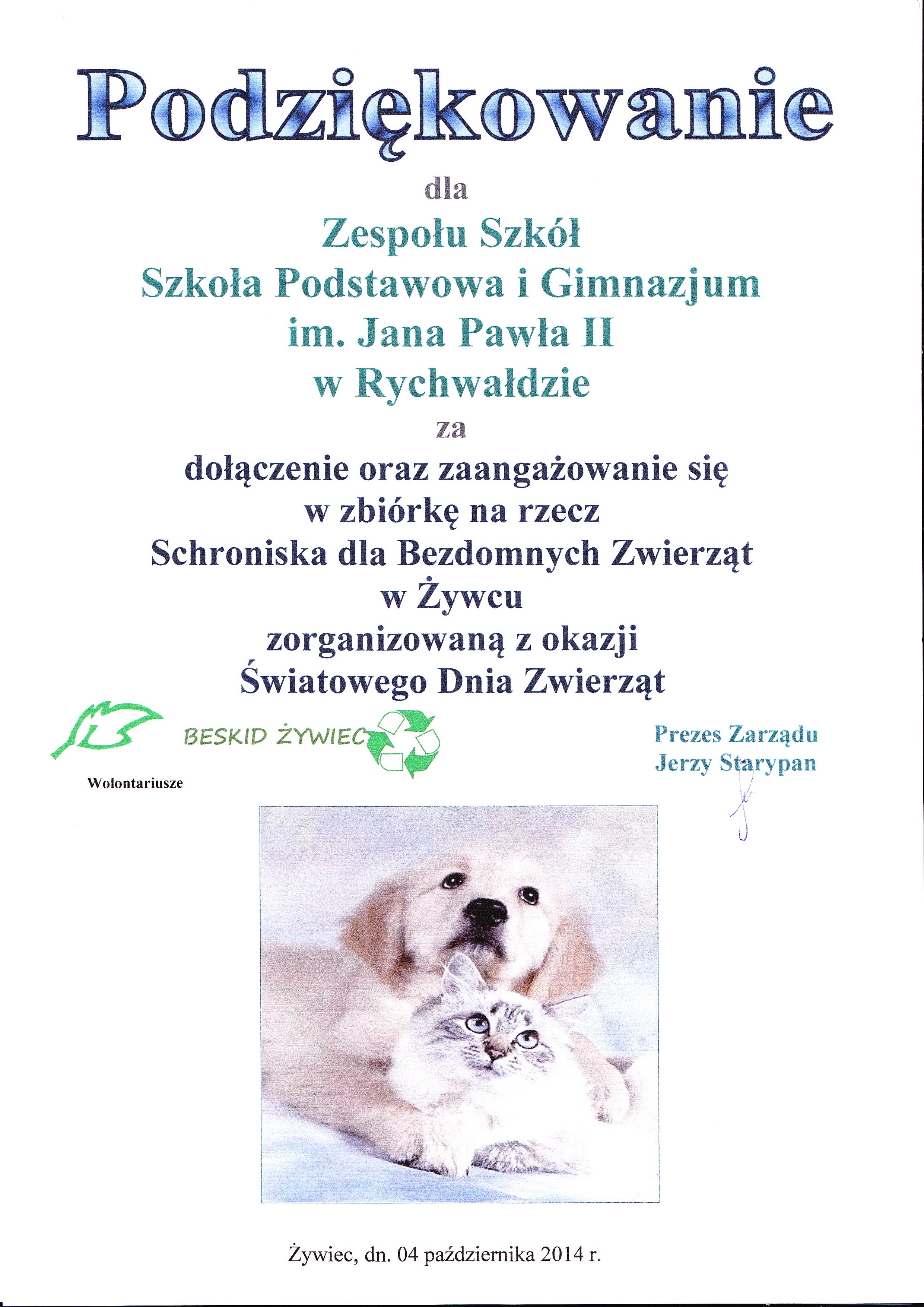 Zachęcamy do przyłączenia się do akcji "Nakarm zwierzaka", która w tym roku przebiega pod hasłem: Nieśmy pomoc czworonogom. Klasa V, organizator akcji, zbiera karmę dla psów i kotów ze Schroniska dla Bezdomnych Zwierząt w Żywcu. Co prawda zbiórka miała zakończyć się 30 września, jednakże w związku z licznymi prośbami została przedłużona do końca tego tygodnia, tj. do 3 października. Wszystkich miłośników psów i kotów prosimy więc o przynoszenie suchej karmy lub tej w puszkach, kaszy, makaronu, a także używanych, niepotrzebnych smyczy i obroży. Za pomoc z góry dziękujemy.