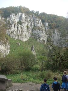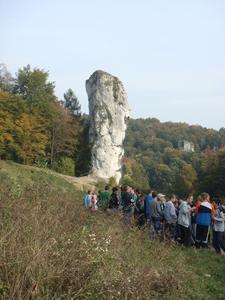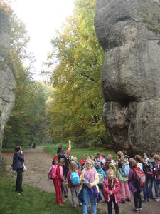 Pobyt w nowoczesnym muzeum, makieta parku i filmu 3D rozbudziły nasze apetyty na zwiedzanie parku. Razem z przewodnikiem spacerowaliśmy doliną Prądnika i podziwiali skały wapienne min.: Igłę Deotyny, Bramę Krakowską, Białą Rękawicę, przepięknie w komponowane w jesienne barwy drzew liściastych. Pełni zachwytu dotarliśmy do jaskini Łokietka, gdzie czekała nas prawdziwa uczta wrażeń. Pomimo ciemności i wiszących nad głowami nietoperzy podziwialiśmy szatę naciekową groty , powstałą w wyniku procesów geologicznych min. stalaktyty rurkowe (tzw. makarony). Według legendy w grocie tej ukrywał się sam król Władysław Łokietek przed wojskami Wacława II - króla czeskiego. Łokietka miał uratować pająk, który w otworze jaskini uwił sieć, dzięki czemu wydawała się nie zamieszkana i zapomniana, natomiast władca został do niej spuszczony wąskim otworem od strony stropu. Pamiątką po tym wydarzeniu są nazwy jaskini oraz poszczególnych jej komór, a także brama w kształcie pajęczej sieci, zamykająca wejście.