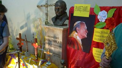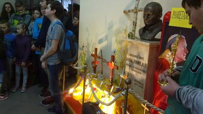 Z okazji rocznicy w naszej szkole odbył się uroczysty apel. Jan Paweł II był z nami obecny w znaku relikwii przyniesionych przez katechetę O. Mateusza.