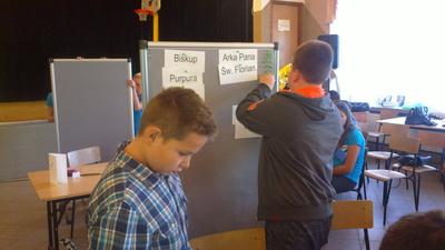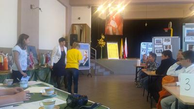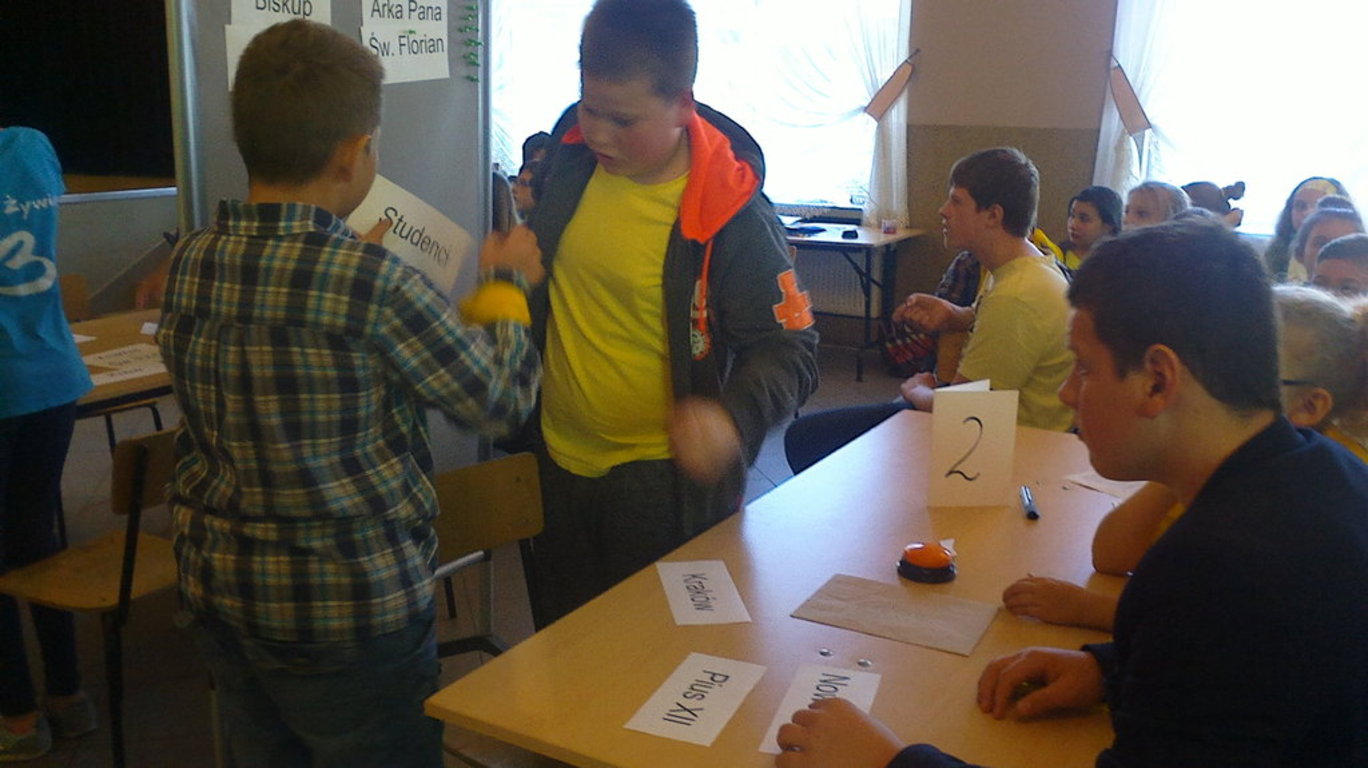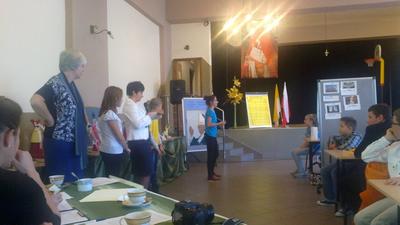 Zaproszeni goście na czele z P. Wójtem Leszkiem Frasunkiem, Dyrektorami Szkół, Księżmi Proboszczami oraz kibicami reprezentującymi swoje drużyny podziwiali zmagania drużyn i byli pod wielkim wrażeniem ogromnej i dokładnej wiedzy jaką posiadali finaliści. Emocje pokonkursowe ostudziły wyśmienite kremówki i zdrowy sok owocowy. Na zakończenie uczestnicy otrzymali nagrody ufundowane w ramach programu wychowania patriotyczno – religijnego pod hasłem „2015 ROK JANA PAWŁA II” przez Gminną Komisję Rozwiązywania Problemów Alkoholowych.