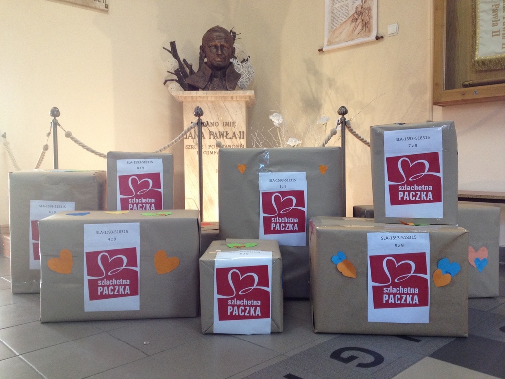 Dziękujemy wszystkim, którzy tak hojnie wsparli tegoroczną akcję "Szlachetna Paczka"! Bez Waszej pomocy nie udałoby się to przedświateczne dzieło pomocy. Z przyjemnością informujemy, iż pozyskaliśmy prawie wszystko, o co prosiła rodzina - żywność, środki czystości, odzież, obuwie, kołdrę, pościel, ręczniki...dużo by tego wymieniać:-) W sumie zapakowaliśmy dary w 9 paczek. W transporcie pomogli ojcowie franciszkanie, za co składamy serdeczne "Bóg zapłać".