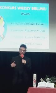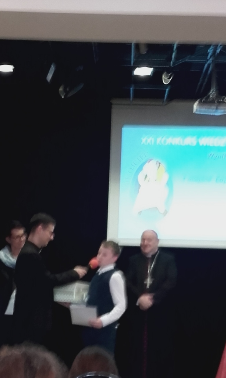 Jasiu Karbowski uczeń klasy V został laureatem XXI Konkursu Wiedzy Biblijnej. Konkurs ten przeznaczony jest dla uczniów szkoły podstawowej z klas IV- VI Przedmiotem konkursu była w tym roku Ewangelia według Św. Łukasza, jej wstęp oraz przypisy. Finał konkursu odbył się 31 kwietnia 2016 roku w Górkach Wielkich. Wcześniej rozegrane zostały 2 etapy- szkolny i rejonowy. W etapie diecezjalnym brało udział 57 uczniów z całej diecezji bielsko- żywieckiej. Nasz uczeń zdobył 2 miejsce. W konkursie startował również Marek Habiciak uczeń z klasy VI. Chłopcy odebrali dyplomy i nagrody z rąk ks. biskupa Piotra Gregiera, wójta gminy Brenna, przedstawiciela kuratorium.
