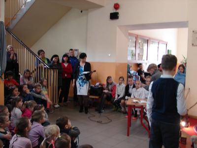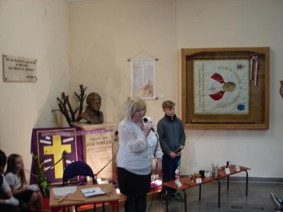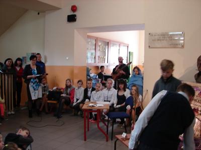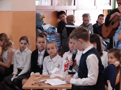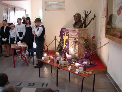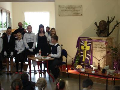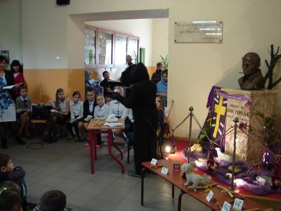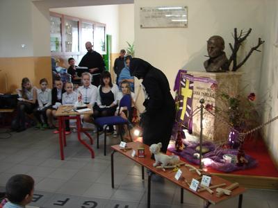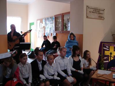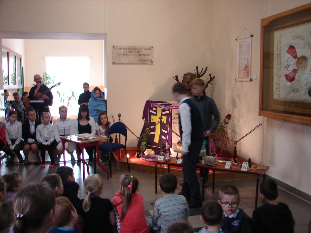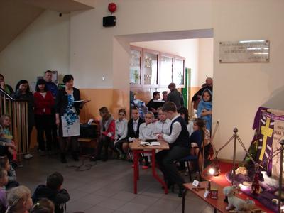 W nastroju Wielkiego Tygodnia klasa V pod okiem katechetów przygotowała przedstawienie pt. „Mój Chrystus połamany”. W ciszy i w skupieniu społeczność szkolna zgromadzona w miejscu patrona szkoły przeżywała rozterki młodzieńca, w którego rolę odgrywał Jasiu Karbowski. Chciał on zreperować poniszczoną figurkę Jezusa, którą kupił w antykwariacie za złotówkę. Wzruszające słowa Jezusa, w które wcielił się Andrzej Hubka, przekonały słuchaczy, że naprawa wcale nie jest Jezusowi potrzebna. Dziś o wiele więcej są Mu potrzebne nasze ręce, nogi i serce, aby przez nas mógł pomagać innym. Jak odpowiemy na prośbę Jezusa?