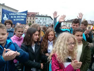 Spotkanie rozpoczęło się powitaniem szkół im. Jana Pawła II i złożeniem kwiatów przed pomnikiem Jana Pawła II przy Bazylice Ofiarowania NMP. O godzinie 10.00 na rynku przed Bazyliką uczestniczyliśmy w uroczystej Mszy Świętej pod przewodnictwem ks. Biskupa Jana Szkodonia. Po Mszy Świętej na wadowickim rynku radowaliśmy się wspólnie podczas koncertu urodzinowego „Śpiewajmy Ojcu Świętemu” w wykonaniu przedszkolaków z Przedszkola nr 2 w Wadowicach i Zespołu Szkół CKU w Radoczy. Jako gość specjalny wystąpił zespół „Jakubowe Muszelki” z Więcławic Starych.