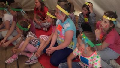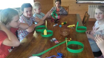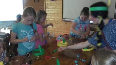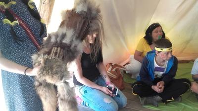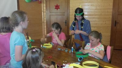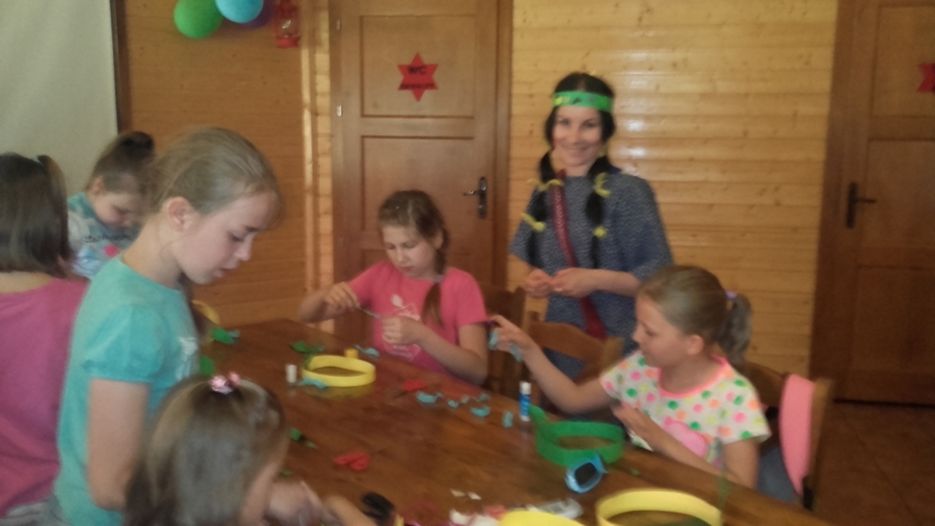 Dojechaliśmy więc w upale pod wskazany adres do Wioski Indian i Traperów. Indianki, owszem, były – dwie – trochę w niezupełnie indiańskich strojach, ale za to miały indiański zapał i wenę twórczą. Zaprowadziły nas do chłodnego współczesnego drewnianego pawilonu, do a la saloonu i dalej o Indianach nas informować. Jaki to wspaniały naród, skąd pochodzi, czym się trudni itp. Potem był sprawdzian z opanowanej wiedzy i nasi czwartoklasiści zabłysnęli pamięcią. Wszystko wiedzieli. Jeszcze większy animusz pokazali przy pracach manualnych, bo jak się chce być prawdziwym Indianinem, to trzeba mieć specjalny pióropusz, twarz pomalowaną na dzikie kolory i znać indiańskie zawołanie.