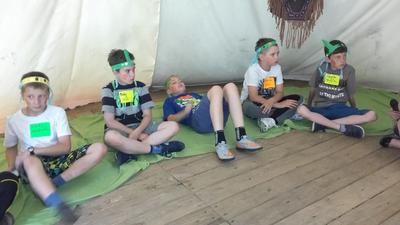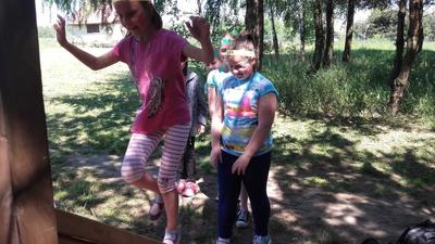 Zanim dostaliśmy się na teren zajmowany przez Indian i weszliśmy do tipi, były testy sprawnościowe na moście Apaczów i równoważni Czejenów. Potem blade twarze otrzymały indiańskie nowe imiona. Nieważne, że dziewczynka otrzymała imię Winnetou, nieważne, że dwuczłonowe imiona były pisane niezgodnie z zasadami polskiej ortografii, ważne, że bawiliśmy się całą gębą. Jednak najbardziej kusiło nas złooooto. Oto w starej wannie napełnionej wodą z dużą ilością żółtego piasku kryły się monety. Kto co wyłowił, było jego. Największy łup to… 2 złote i kilka groszy, ale bezcenne emocje w wyławianiu pieniędzy i tylko dwie szanse. Potem było trochę gorzej, bo czwartoklasiści to naród indywidualistów, a chodzenie zespołowe w „nartach” z kilkoma wiązaniami było trudne i co rusz zaliczaliśmy glebę. Dobrze, że było miękko, trawa wcześniej skoszona, niezgrabiona, więc nie było sińców na tyłku. Jeszcze jednym wyzwaniem było trafienie do tarczy, ale tutaj prawie wszyscy do poprawki. Niektórzy albo nie widzieli tarczy, albo tarczę widzieli, tylko strzała szybowała… aż do nieba. Chyba z tego powodu w Ogrodzieńcu łuk i strzały były najbardziej atrakcyjną pamiątką dla Indian z Rychwałdu z klasy czwartej. Na koniec było przeciąganie liny, ale już byliśmy bardzo zmęczeni upałem, ciężką pracą kopaczy złota i nudą, więc bez żalu pojechaliśmy do Ogrodzieńca, do zamku.