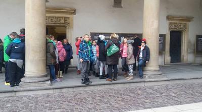To było dla nas poważne wyzwanie, bo Wawel siedziba królów polskich była dla nas pełna tajemnic, które chcieliśmy zgłębić. Plan naszej wizyty w „domu” władców Polski przedstawiał się następująco: najpierw Reprezentacyjne Komnaty Królewskie, potem Prywatne Apartamenty Królewskie, następnie Skarbiec Koronny i Zbrojownia i na koniec Wawel Zaginiony. Wspaniała przewodniczka docierała do naszej wyobraźni wesołymi anegdotami, konkursami związanymi z zapamiętaną wiedzą, więc nie nudziliśmy się ani przez minutę, mimo że w każdej sali opowieści słuchaliśmy z pozycji parteru, czyli siadając na posadzce królewskich apartamentów. Młodszej części wycieczkowiczów najbardziej przypadł do gustu Skarbiec Koronny i Zbrojownia, bo piątoklasiści już wyobrażali sobie, jak będą wyglądać w zbroi, na koniu i z ciężkim mieczem w dłoni. Ale perspektywa walki w takim rynsztunku niektórych wystraszyła tak, że chyba woleli oglądać ekspozycję niż zostać prawdziwym rycerzem.