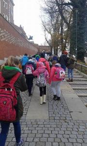 Po oprowadzaniu z przewodnikiem jeszcze indywidualnie obejrzeliśmy na Wawelu to, co każdego interesowało osobiście. I nasi uczniowie znowu nas zaskoczyli tym, że chcieli zobaczyć miejsce koronacji królów Polski i ich pochówku, bo spoczywają tu prawie wszyscy królowie od Władysława Łokietka do Stanisława Leszczyńskiego – łącznie siedemnastu królów, wliczając królową Jadwigę i Annę Jagiellonkę, członkowie rodzin królewskich, wodzowie, przywódcy polityczni i wieszcze narodowi. Dzieci dopytywały o różne szczegóły związane np. ze sprowadzeniem zwłok Adama Mickiewicza, dlaczego trumna Józefa Piłsudskiego jest metalowa. Przy okazji dowiedziały się, że serce marszałka Piłsudskiego zgodnie z jego testamentem przewieziono do Wilna, gdzie spoczęło na cmentarzu „Na Rossie”. Byliśmy także przy grobie zmarłego tragicznie prezydenta RP Lecha Kaczyńskiego.