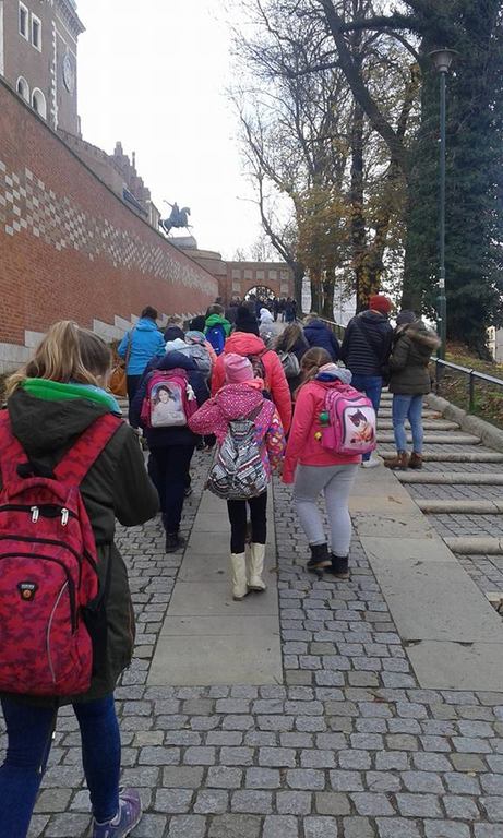 Wyjechaliśmy 8. listopada 2016 r. w mroźny jesienny poranek. Mgła dobrze wróżyła, bo kiedy opadła, ukazało się piękne słońce i od razu dodało nam animuszu. Nawet ci najmłodsi uczestnicy wyjazdu zawsze niecierpliwi i stale pytający –„a kiedy dojedziemy” nie przynudzali. Może dlatego, że postój na stacji benzynowej, był okazją do zjedzenia pierwszego wycieczkowego hot-doga, zapiekanki czy innych smakołyków. Toteż z nową energią i ze słońcem dotarliśmy do Krakowa około dziesiątej. Obudzone już miasto czekało na nas z przekupkami na Rynku, straganami z pamiątkami i hejnałem z wieży kościoła Mariackiego. Na ten hejnał długo musieliśmy czekać, bo aż do pełnej godziny. Niektórzy usłyszeli go po raz pierwszy.
