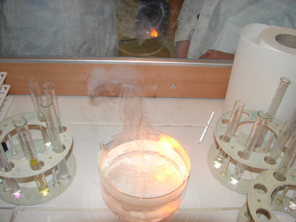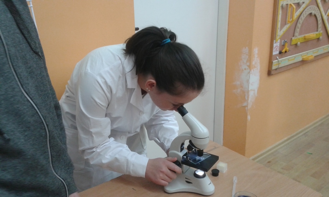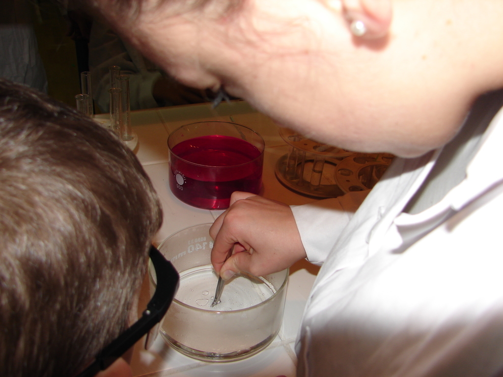 Na warsztatach biologiczno-chemicznych uczniowie badali obecność skrobi w produktach spożywczych. Efekt swojej pracy mogli sprawdzić pod mikroskopem. Wybarwione roztworem jodyny ziarna skrobi pięknie prezentowały się w obiektywie. Uczniowie badali także aktywność różnych metali w zimnej i gorącej wodzie oraz w kwasie solnym. Największe emocje wzbudził sód, który bardzo aktywnie reagował w każdym środowisku. Pięknie zapalił się na wodzie, a otrzymany wodór wywołał widowiskową "eksplozję". Otrzymany roztwór uczniowie zbadali fenoloftaleiną. Malinowe zabarwienie potwierdziło, że w wyniku doświadczenia powstał roztwór wodorotlenku. Ciekawość wzbudził stop Wooda, który w gorącej wodzie stał się miękki i elastyczny. Zajęcia prowadziła Ewa Kopacz.