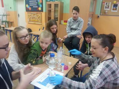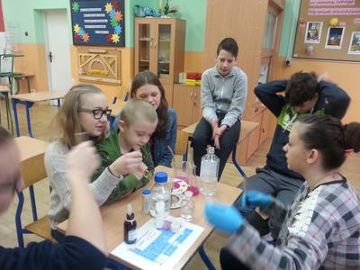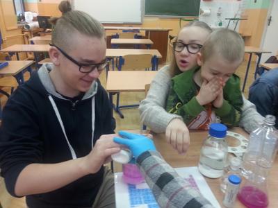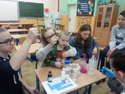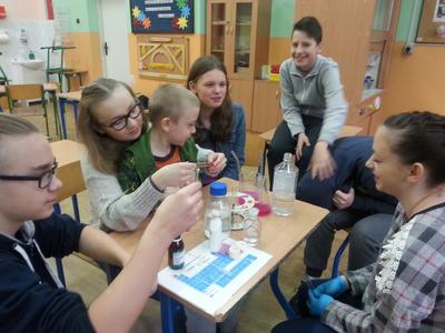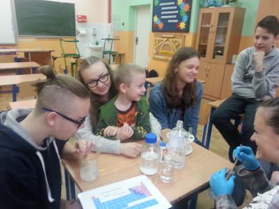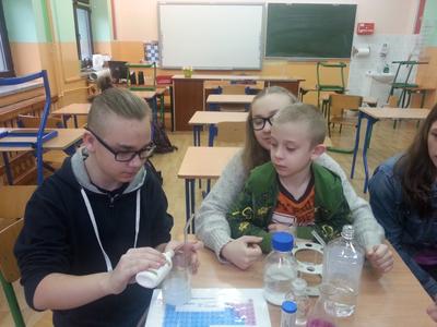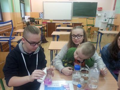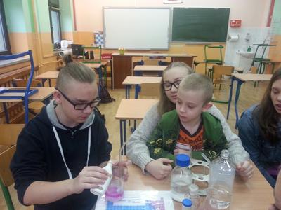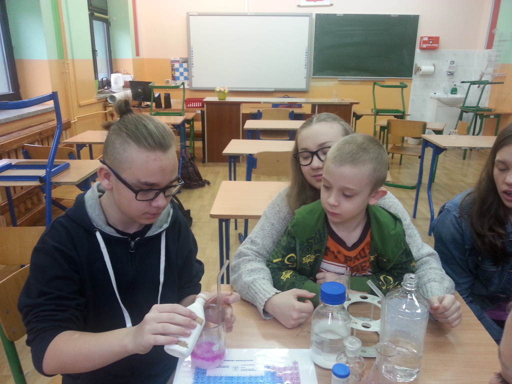 Uczniowie bardzo chętnie uczestniczą w warsztatach chemicznych. Na ostatnich zajęciach uczniowie sprawdzali pH różnych roztworów za pomocą wskaźników: papierków uniwersalnych, fenoloftaleiny, oranżu metylowego i błękitu tymolowego. Marek i Anetka sprawdzili przy pomocy zasady wapniowej zawartość CO2 w wydychanym powietrzu. Warsztaty chemiczne przyciągają coraz młodszych uczestników. Wykorzystujemy szkło i sprzęt laboratoryjny oraz odczynniki chemiczne zakupione w ramach projektu unijnego "Piękny Umysł".