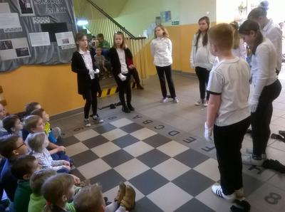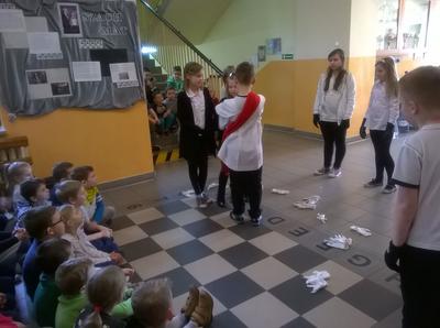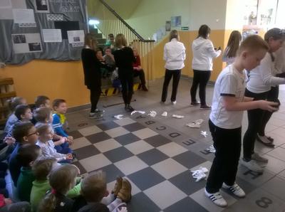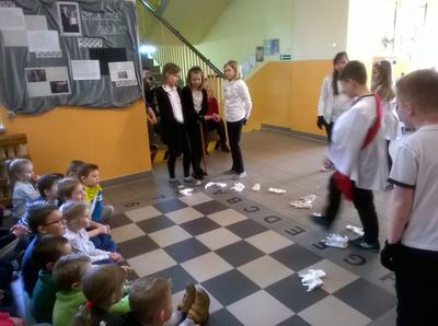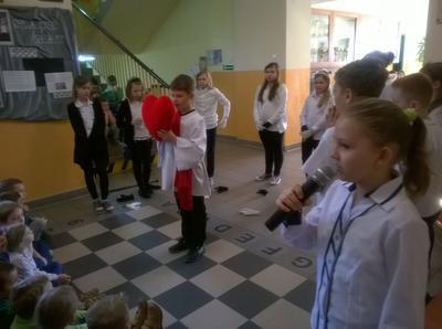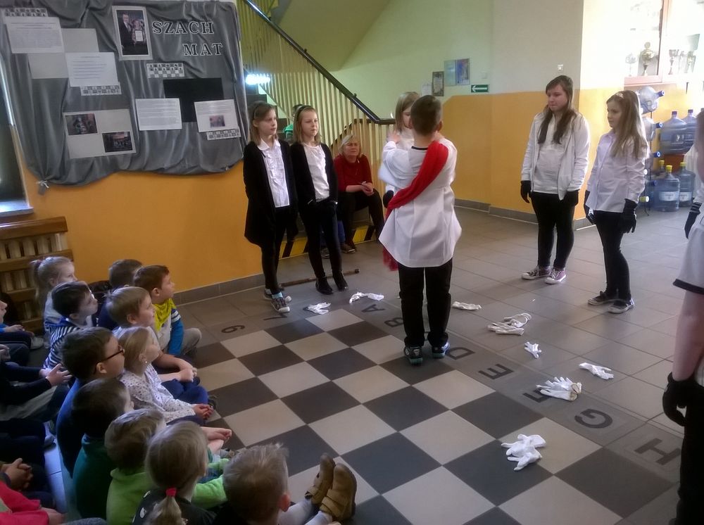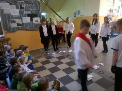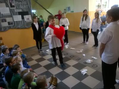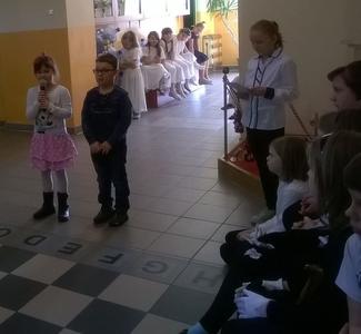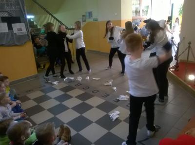 Uczniowie klasy IV zaprezentowali swym kolegom oraz gościom – przedszkolakom przygotowaną pod kierunkiem wychowwczyni krótką inscenizację pt.: „Czyje ręce wybrać?” . Zgromadzeni z zainteresowaniem obejrzeli to przedstawienie, w którym połączono muzykę, słowo i ruch.