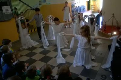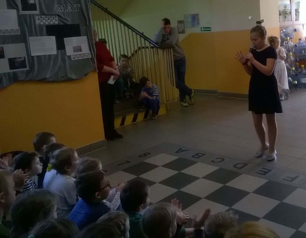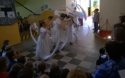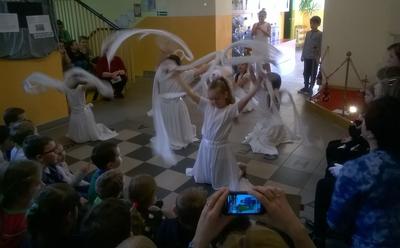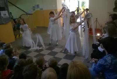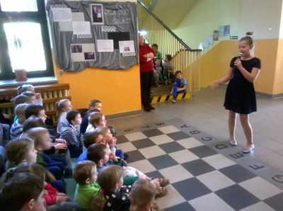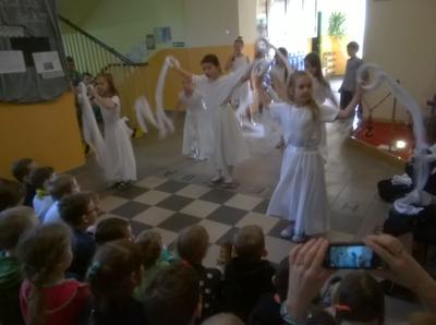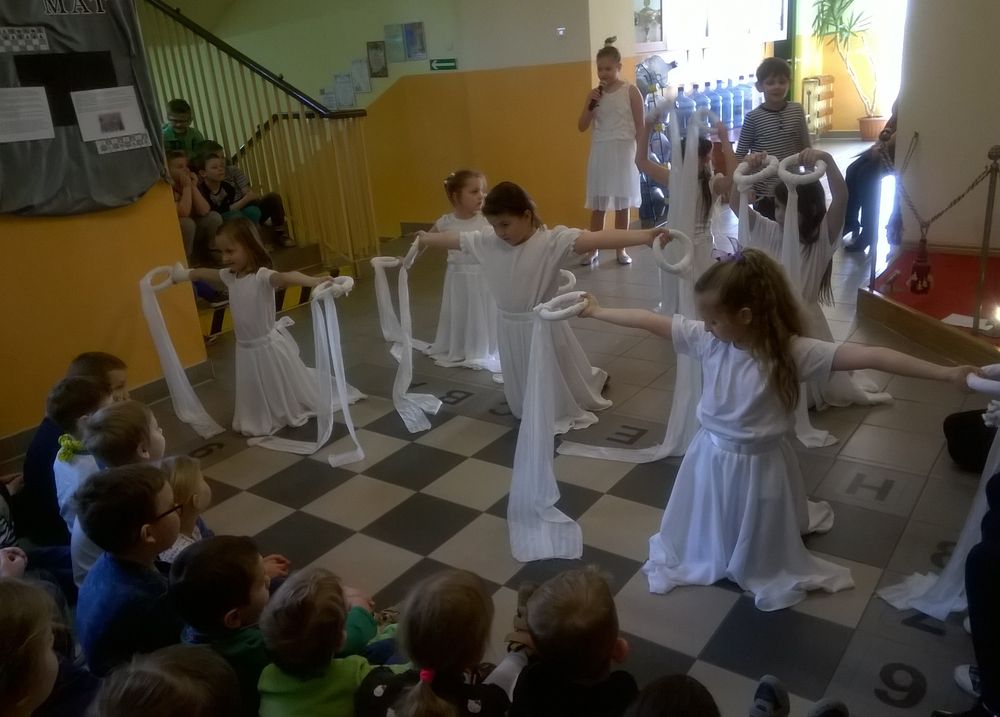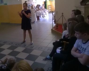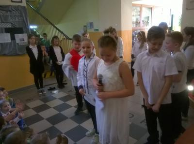 Następnie Ania Walatek z klasy IV zaśpiewała piosenkę „Halleluja”.Towarzyszyła jej grupa taneczna z klasy II, która zaprezentowała ciekawy układ choreograficzny przygotowany przez p. Dorotę Walatek.