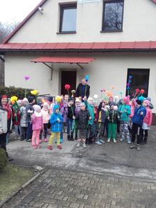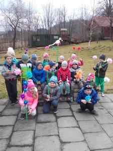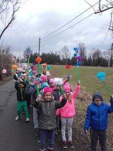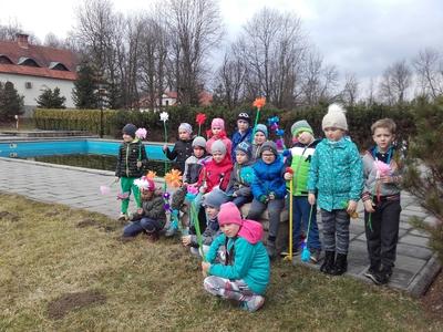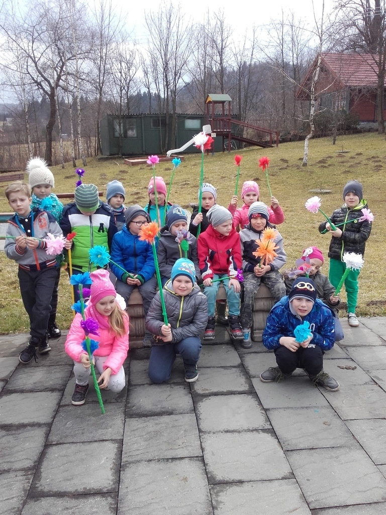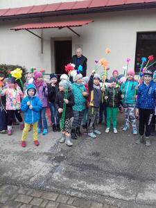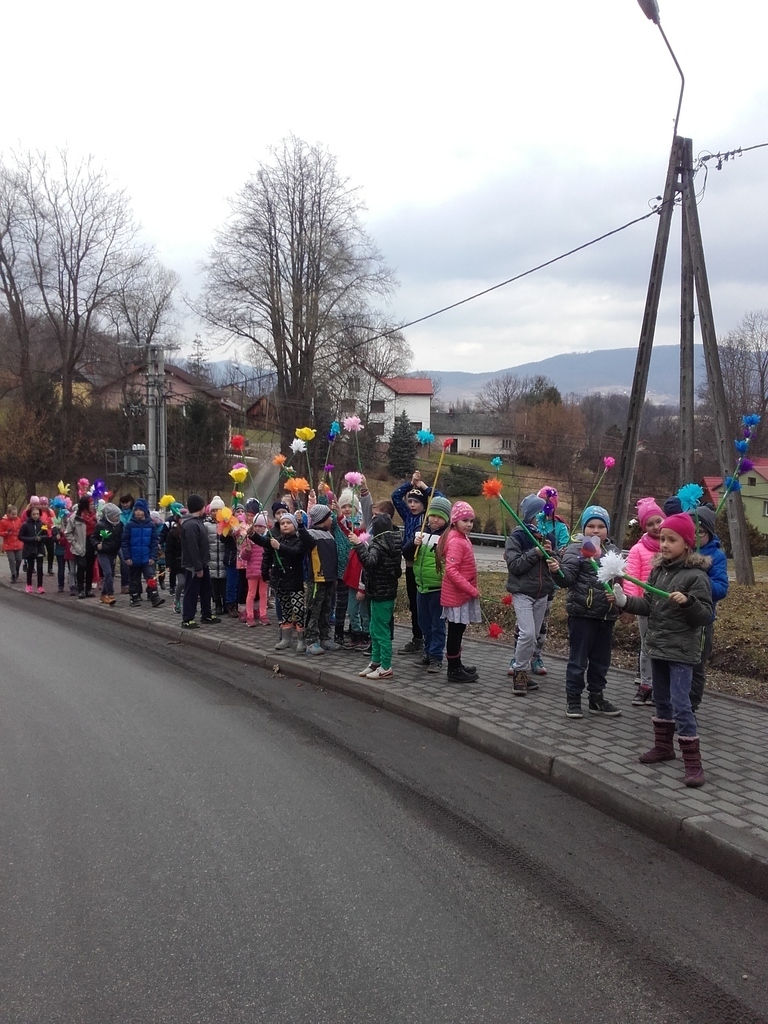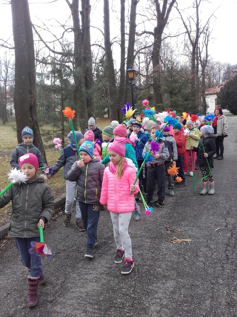 21 marca 2017r. w pierwszym dniu kalendarzowej wiosny uczniowie klas I-III słowami tej piosenki pragnęli powitać wiosnę. Najpierw na zajęciach plastycznych z pomocą koleżanek z gimnazjum wykonywali kwiaty. Następie w pochodzie kwiatowym wyruszyli szukać pierwszych zwiastunów wiosny. Udali się na spacer po najbliższej okolicy. Po drodze pozdrawiali mieszkańców i kierowców mijających samochodów, machając wysoko uniesionymi kwiatami. Spotkali też przedszkolaków, udających się na poszukiwanie wiosny. Pochód kwiatowy przeszedł ulicą Franciszkańską, Spacerową i dotarł na posiadłość Domu Wypoczynkowego „Dwór”. W słabych promieniach słońca i jeszcze w zimnych podmuchach wiatru wypatrywali wiosny. W tym roku opóźnia ona swe nadejście. Uczniowie dostrzegli pierwsze oznaki wiosny- kwitnące przebiśniegi i wysłuchali śpiewu ptaków. Jednak na prawdziwe nadejście wiosny trzeba jeszcze poczekać. Na razie muszą zadowolić się kolorowymi kwiatami z bibuły, które zdobią nasze klasy.