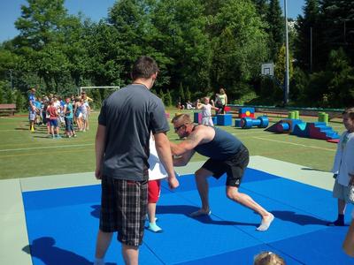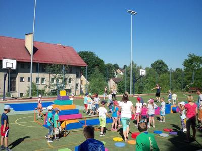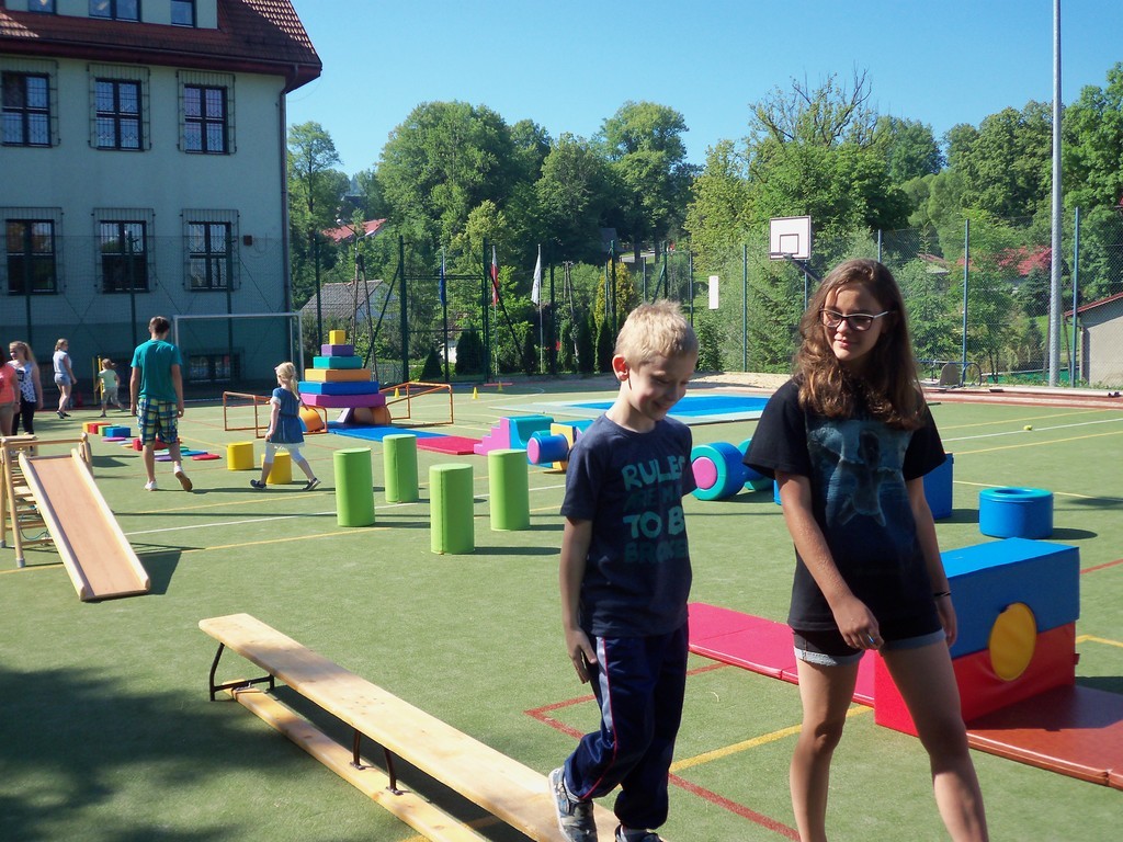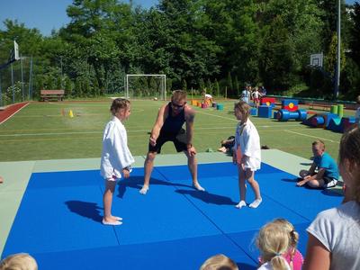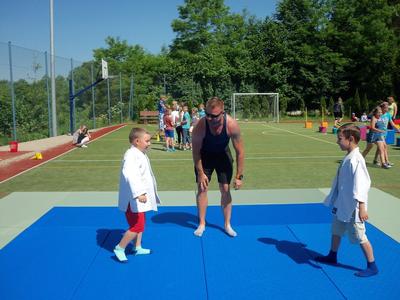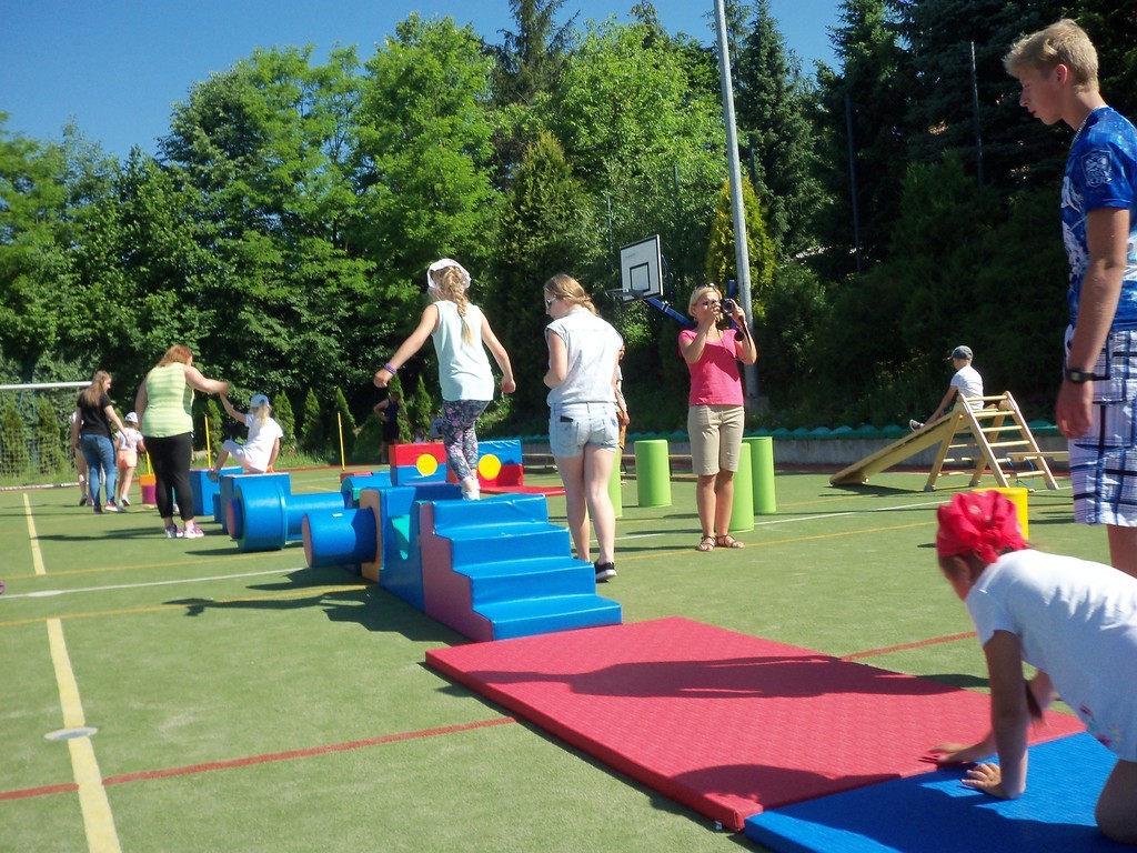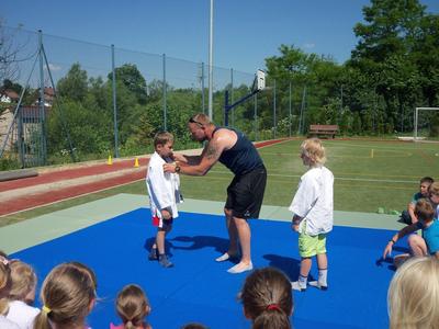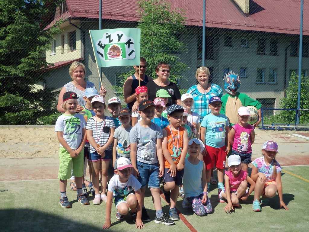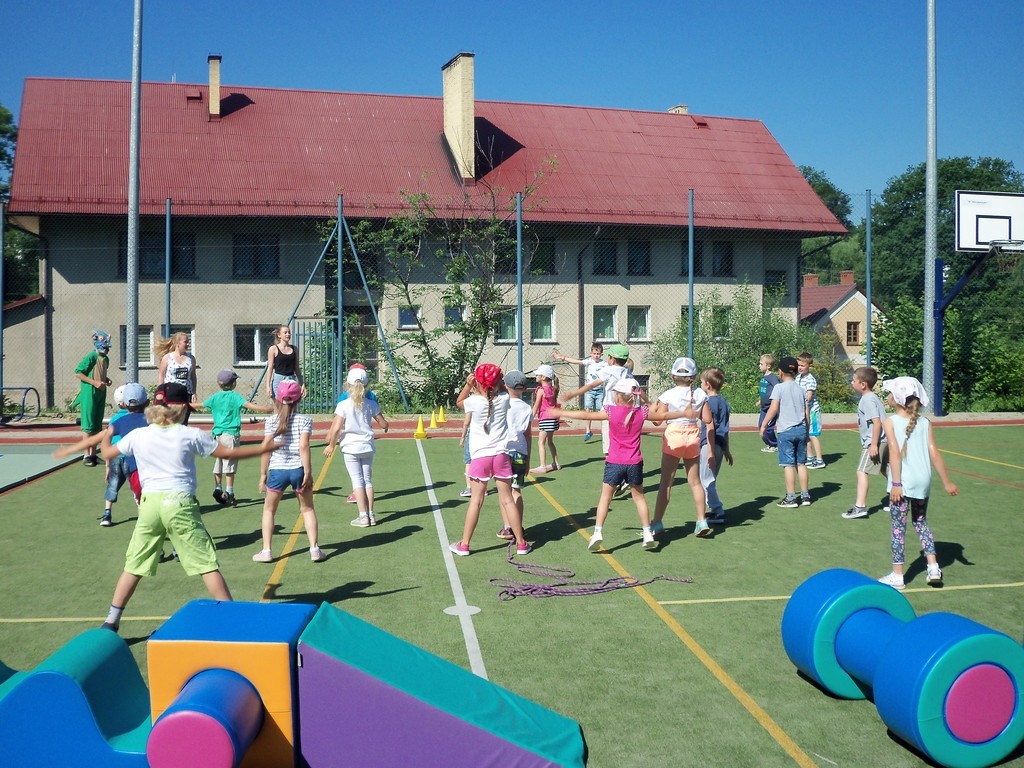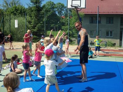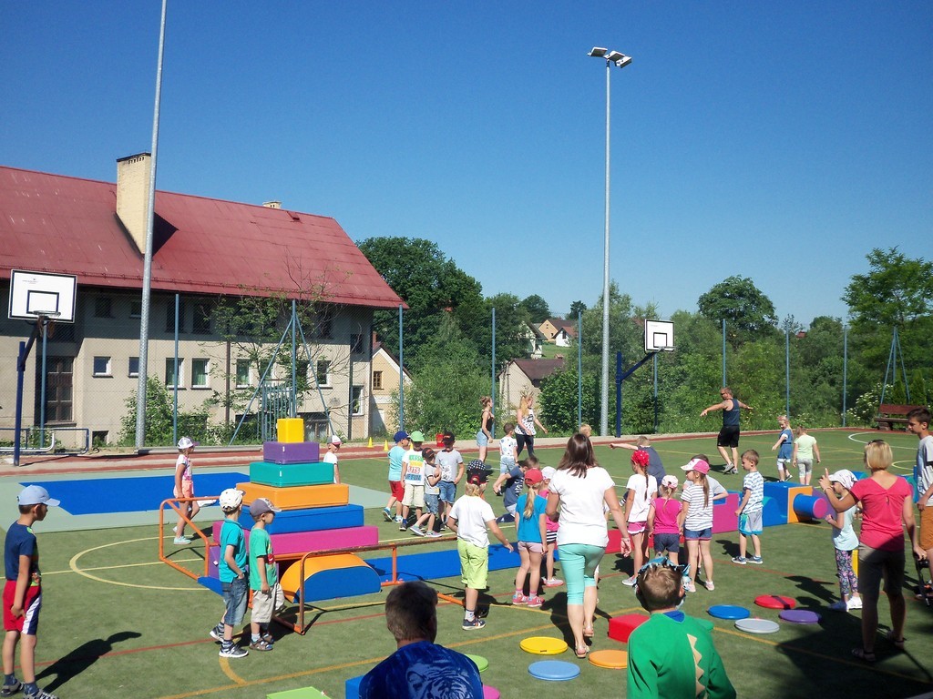 Jak co roku uczniowie klasy III gimnazjum wspólnie z nauczycielami: Urszulą Ostrowska, Elżbietą Marszałek, Agnieszką Knapek i Dariuszem Kudzią zorganizowali dla najmłodszych uczniów naszej szkoły i najstarszych przedszkolaków Olimpiadę Sportową. Organizatorzy zadbali o urozmaicone konkurencje, medale, nagrody i poczęstunek dla olimpijczyków. Jak każda olimpiada, także nasza rozpoczęła się uroczyście od odśpiewania hymnu państwowego oraz hymnu olimpijskiego, podczas którego uczniowie wciągnęli na maszt flagę narodową, unijną oraz olimpijską. Dzieci rywalizowały z wielkim zaangażowaniem i wszyscy zasłużyli na złote medale. Dodatkową atrakcją były zawody siłowe na matach. Cieszyły się one wielkim zainteresowaniem. Uczniowie dobierali się w pary, a wygrywał ten, któremu udało się wypchnąć przeciwnika z pola walki. Uczeń klasy III gimnazjum Filip Dybał uczył dzieci udzielania pierwszej pomocy przedmedycznej. Wszyscy świetnie się bawili z maskotką olimpiady, którą w tym roku był Smok. Wcielił się w niego Jeremiasz Kamiński.