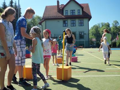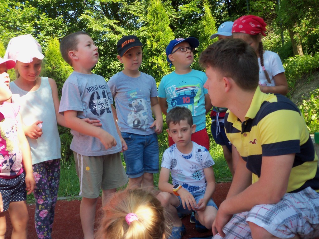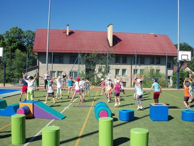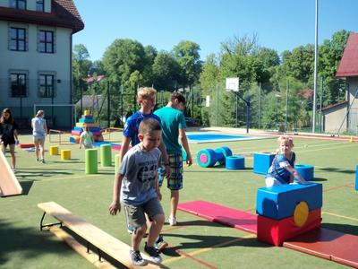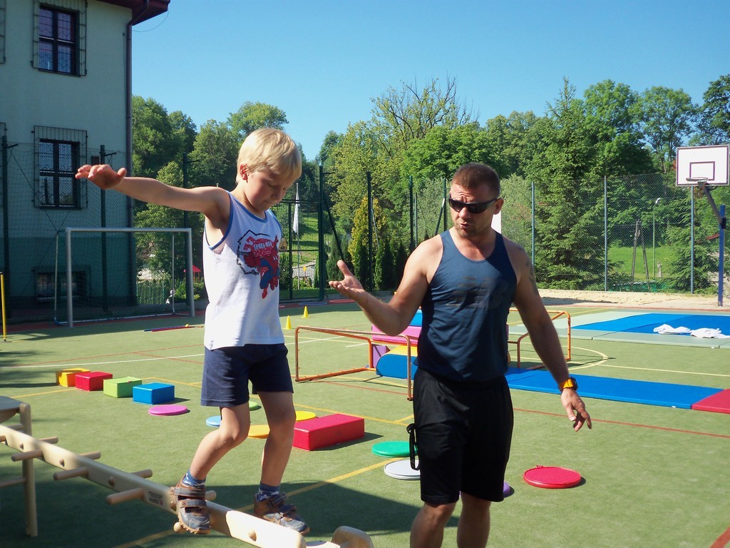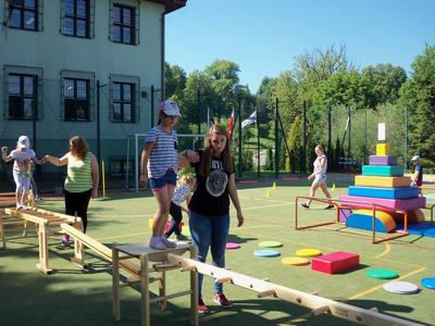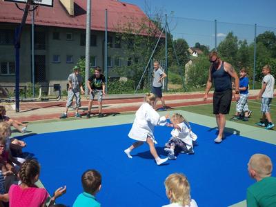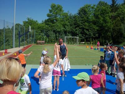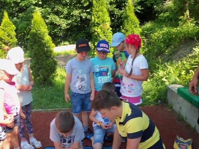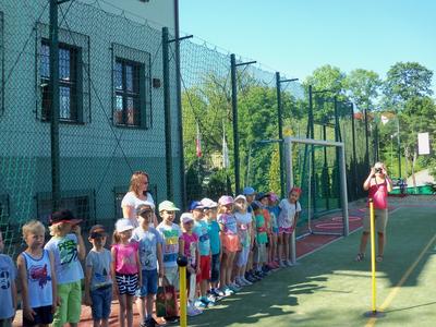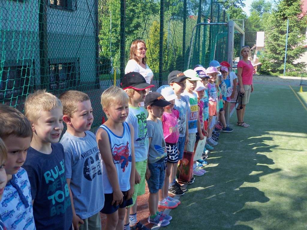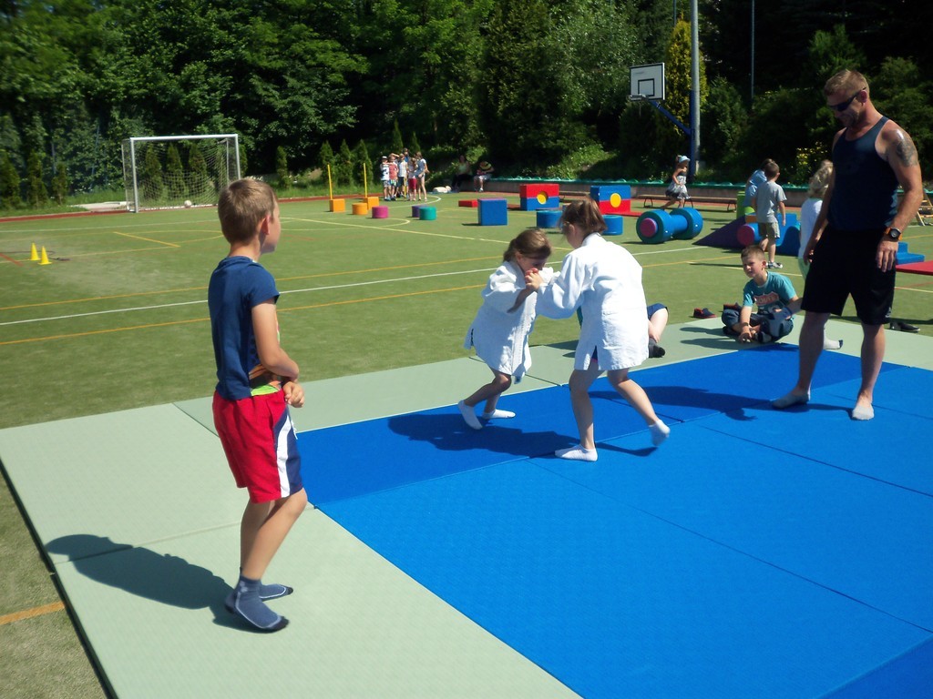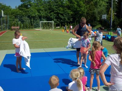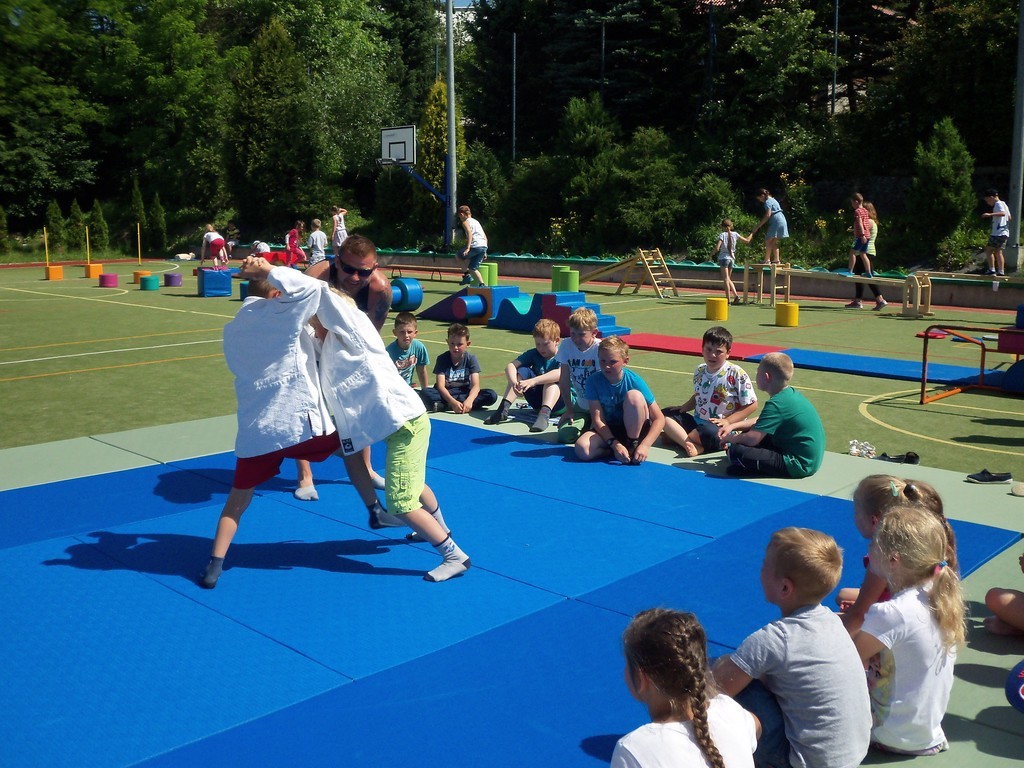 Jak co roku uczniowie klasy III gimnazjum wspólnie z nauczycielami: Urszulą Ostrowska, Elżbietą Marszałek, Agnieszką Knapek i Dariuszem Kudzią zorganizowali dla najmłodszych uczniów naszej szkoły i najstarszych przedszkolaków Olimpiadę Sportową. Organizatorzy zadbali o urozmaicone konkurencje, medale, nagrody i poczęstunek dla olimpijczyków. Jak każda olimpiada, także nasza rozpoczęła się uroczyście od odśpiewania hymnu państwowego oraz hymnu olimpijskiego, podczas którego uczniowie wciągnęli na maszt flagę narodową, unijną oraz olimpijską. Dzieci rywalizowały z wielkim zaangażowaniem i wszyscy zasłużyli na złote medale. Dodatkową atrakcją były zawody siłowe na matach. Cieszyły się one wielkim zainteresowaniem. Uczniowie dobierali się w pary, a wygrywał ten, któremu udało się wypchnąć przeciwnika z pola walki. Uczeń klasy III gimnazjum Filip Dybał uczył dzieci udzielania pierwszej pomocy przedmedycznej. Wszyscy świetnie się bawili z maskotką olimpiady, którą w tym roku był Smok. Wcielił się w niego Jeremiasz Kamiński.