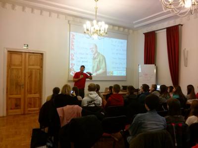 Dzisiejszy dzień na pewno na długo pozostanie w pamięci uczestników warsztatów z języka angielskiego zorganizowanych w ramach projektu Nauka Bez Granic w Krakowie. A dlaczego? Bo były to warsztaty inne niż wszystkie! Po pierwsze, prowadził je Fluency MC - nauczyciel języka angielskiego, raper i autor tekstów, mieszkający na co dzień w Paryżu, a pochodzący z USA. Po drugie, forma warsztatów była nietypowa - rapował Fluency, rapowaliśmy i my! I po trzecie, miejsce - magiczny Kraków.