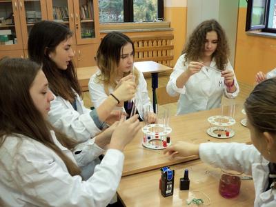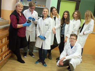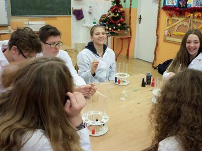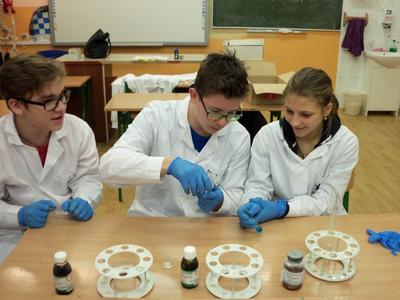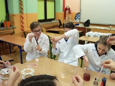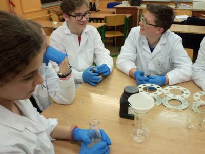 Uczestnicy zajęć z kl. II gimnazjum na warsztatach z chemii w ramach projektu "Piękny Umysł" doskonalili swoje umiejętności przeprowadzania reakcji chemicznych. W pierwszej części zajęć uczniowie utrwalali wiadomości na temat grup krwi. Przeprowadzali doświadczenie, które miało na celu zbadanie, kto może być uniwersalnym dawcą albo uniwersalnym biorcą krwi. Druga część zajęć to przeprowadzanie reakcji strąceniowych, w wyniku których otrzymywaliśmy wodorotlenki nierozpuszczalne w wodzie. Po koniec zajęć przypomnieliśmy sobie wiadomości o wodorotlenku wapnia. Po sporządzeniu zawiesiny z tego wodorotlenki, przesączyliśmy ją, aby powstała woda wapienna do kolejnych zajęć.