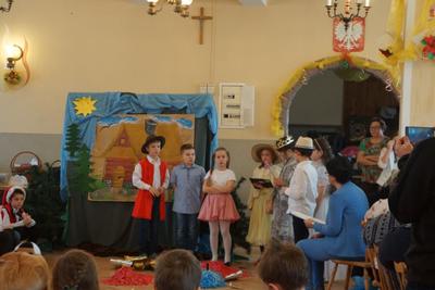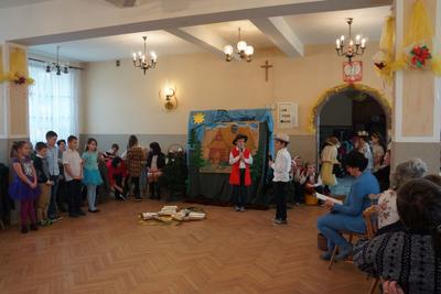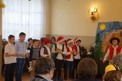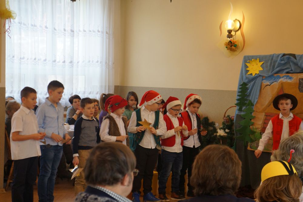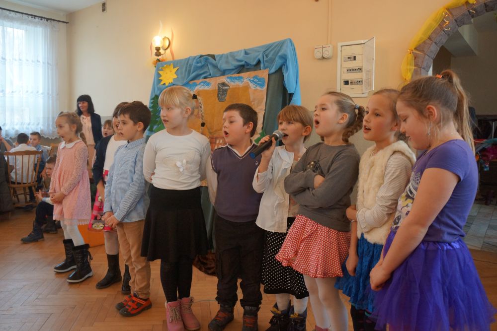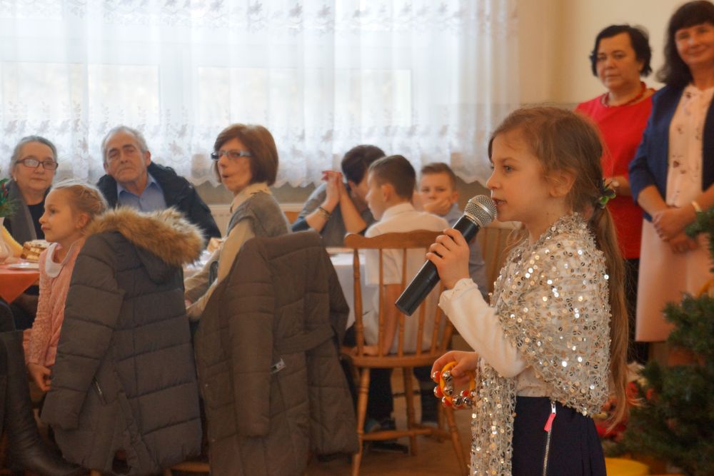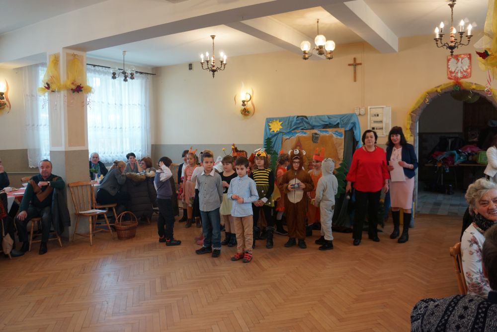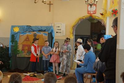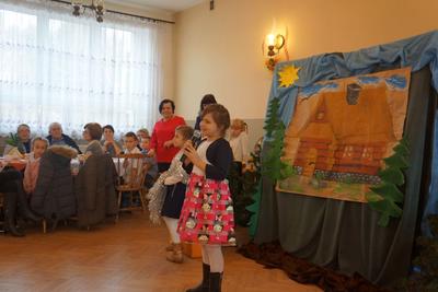 Najważniejszą częścią uroczystości były występy naszych uczniów. Najpierw prezentowały wierszyki i piosenki przebrani za leśne postacie uczniowie z klasy pierwszej i drugiej. Wiewiórki zachęcały dziadków do jedzenia orzeszków, niedźwiadki do łykania miodku. Zdrowie i witalne siły naszych dziadków są przecież bezcenne. Następnie wystąpiły dzieci z klasy trzeciej prosząc dziadków, aby nie przestawali czytać dzieciom bajek i baśni. Współczesne dzieci niechętnie je czytają, wtedy bajki „umierają”, a co gorsze nie rozwijają dziecięcej wyobraźni. Na szczęście na nasze przedstawienie przybyła wróżka Fantazja, która bajki odczarowała i dziadkom czytanie bajek zaleciła. Na zakończenie części artystycznej wszystkie wnuki zaśpiewały tradycyjne sto lat i obdarowali gości własnoręcznie przygotowanymi prezentami, „słodkimi całusami” i życzeniami. Na scenie sali OSP zaprezentowały się też solistki, laureatki przeglądów kolęd i pastorałek, które solo i wspólnie z dziadkami zaśpiewały kolędy.