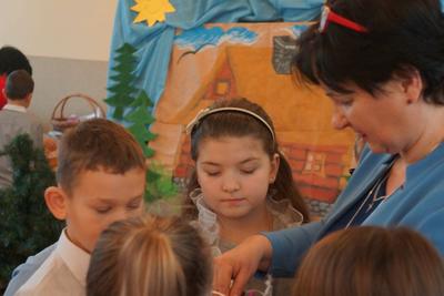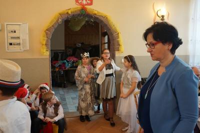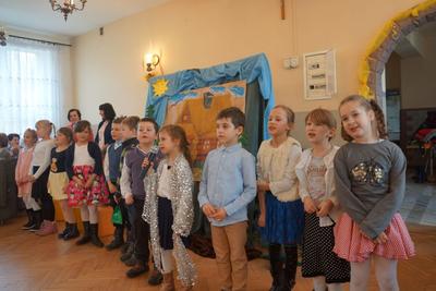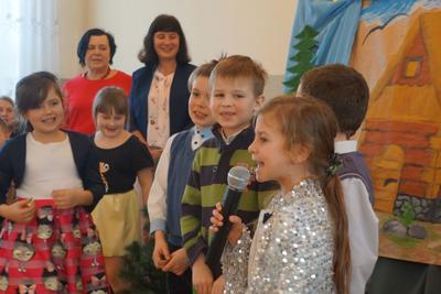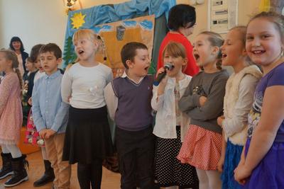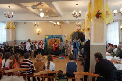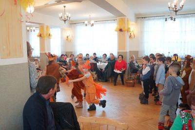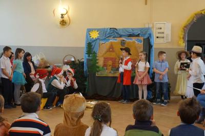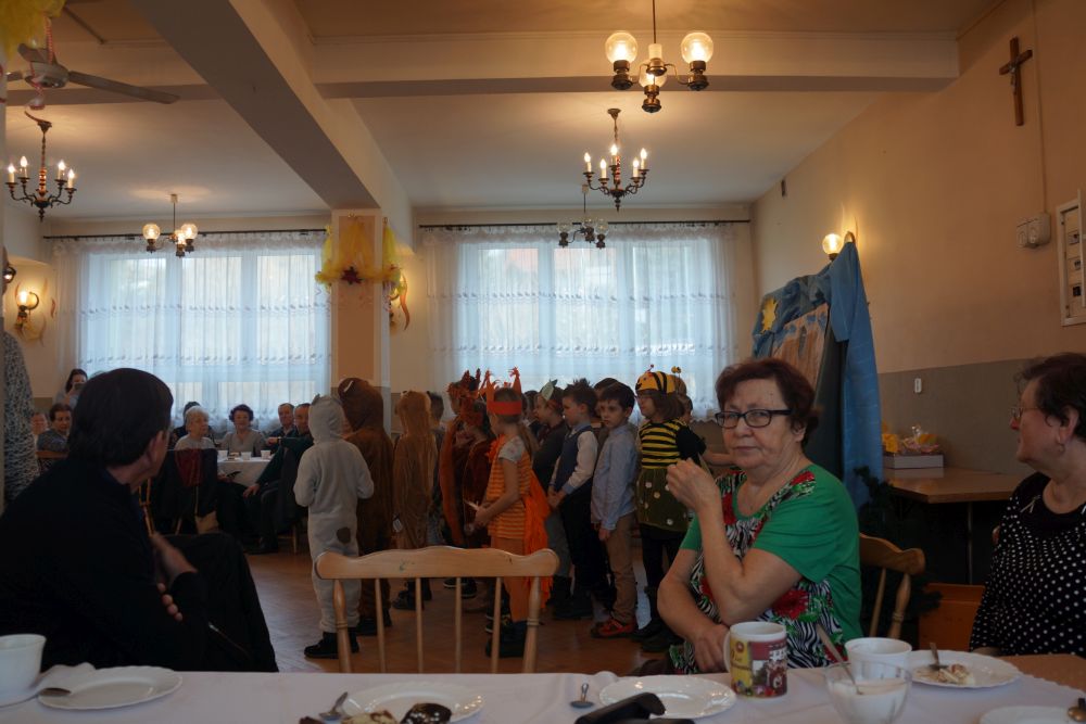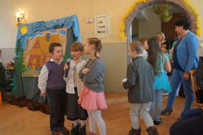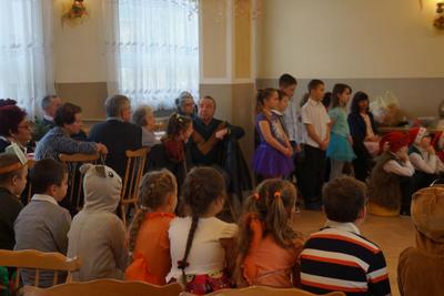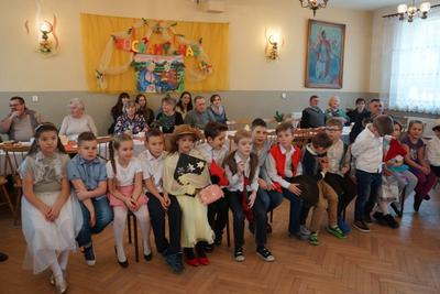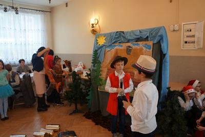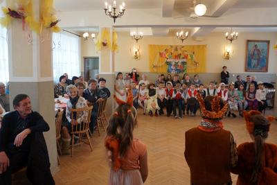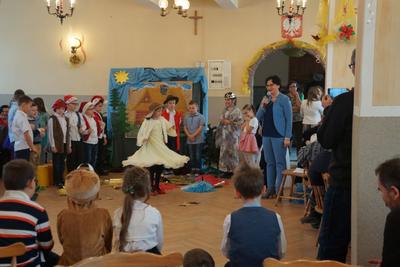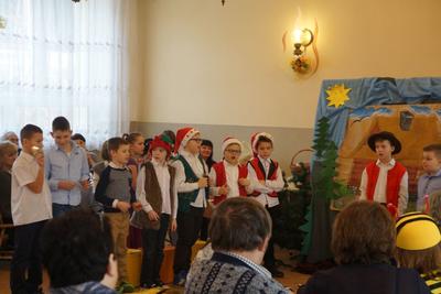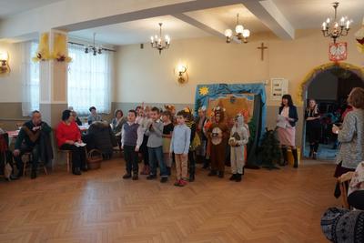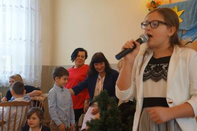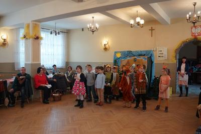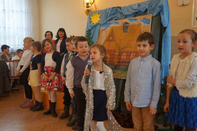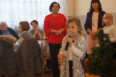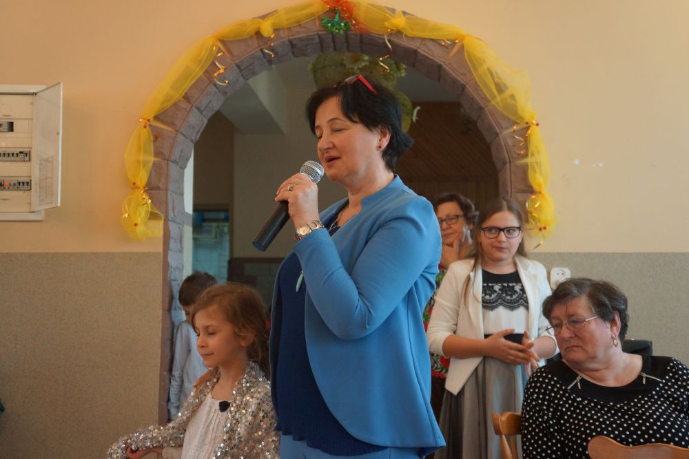 Najważniejszą częścią uroczystości były występy naszych uczniów. Najpierw prezentowały wierszyki i piosenki przebrani za leśne postacie uczniowie z klasy pierwszej i drugiej. Wiewiórki zachęcały dziadków do jedzenia orzeszków, niedźwiadki do łykania miodku. Zdrowie i witalne siły naszych dziadków są przecież bezcenne. Następnie wystąpiły dzieci z klasy trzeciej prosząc dziadków, aby nie przestawali czytać dzieciom bajek i baśni. Współczesne dzieci niechętnie je czytają, wtedy bajki „umierają”, a co gorsze nie rozwijają dziecięcej wyobraźni. Na szczęście na nasze przedstawienie przybyła wróżka Fantazja, która bajki odczarowała i dziadkom czytanie bajek zaleciła. Na zakończenie części artystycznej wszystkie wnuki zaśpiewały tradycyjne sto lat i obdarowali gości własnoręcznie przygotowanymi prezentami, „słodkimi całusami” i życzeniami. Na scenie sali OSP zaprezentowały się też solistki, laureatki przeglądów kolęd i pastorałek, które solo i wspólnie z dziadkami zaśpiewały kolędy.