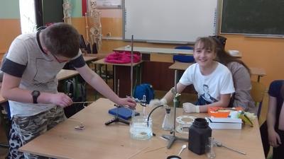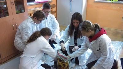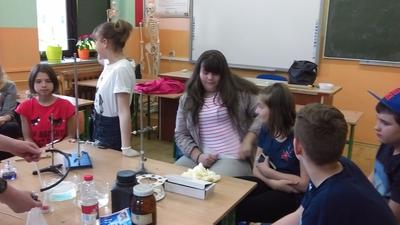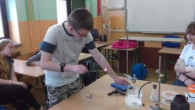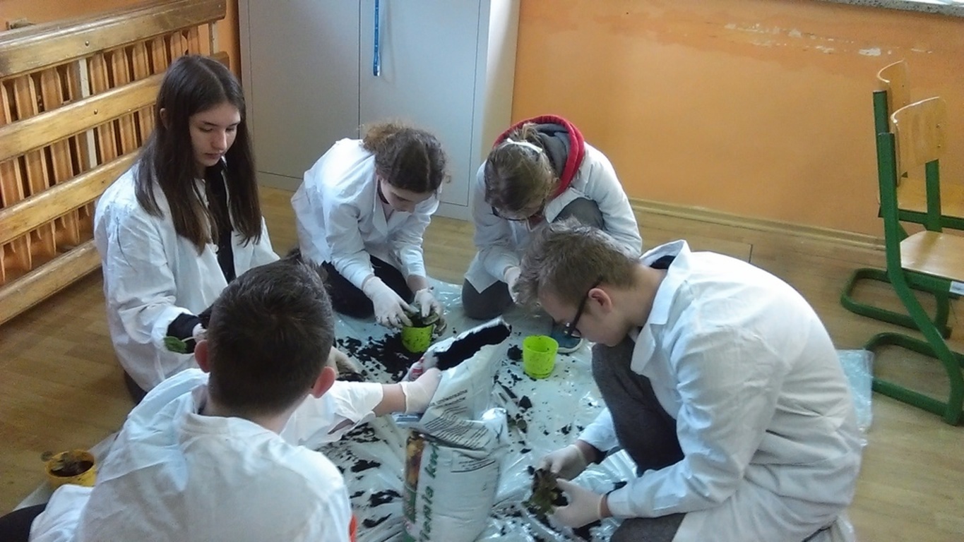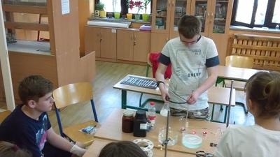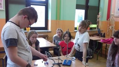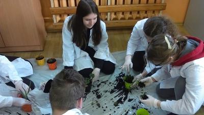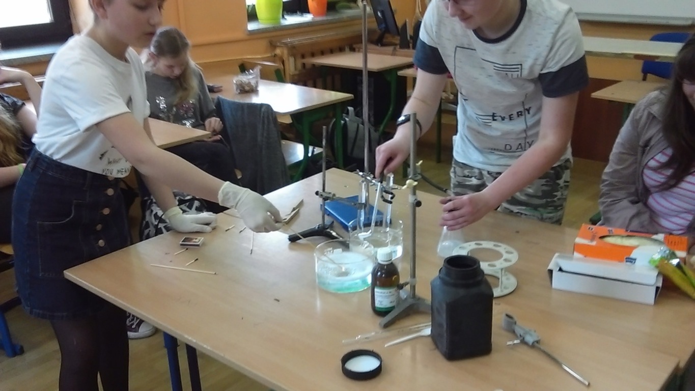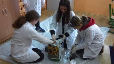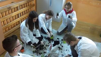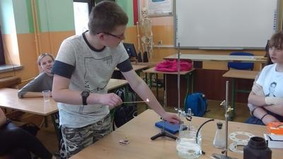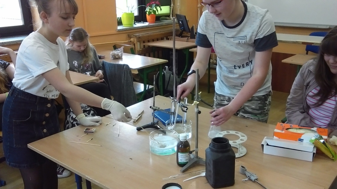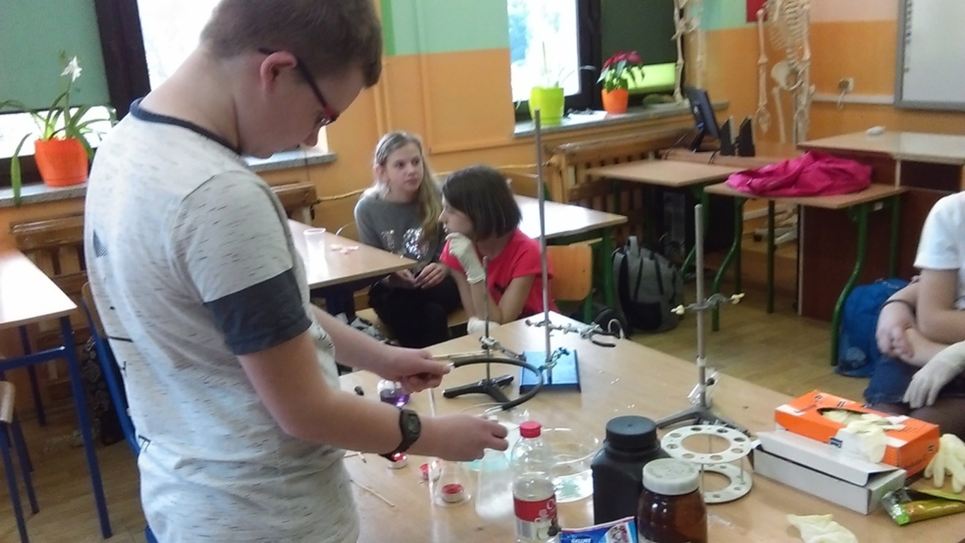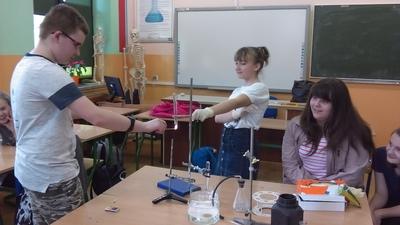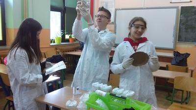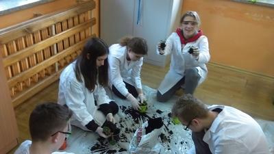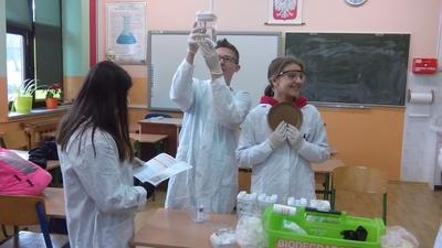 W ramach warsztatów biologiczno-chemicznych uczniowie klasy VII i II gimnazjum wykonują wiele różnych doświadczeń. Otrzymują różne gazy i badają ich właściwości. Uczą się poprawnego wykonywania zestawów do doświadczeń, używanie odpowiedniego sprzętu i szkła laboratoryjnego. Poznają zasady bhp. Bardzo zaangażowali się w przesadzanie i rozsadzanie kwiatów doniczkowych. Posialiśmy również nasiona fasoli w dużej szklanej rurze i będziemy obserwowali jej wzrost. Dużym zainteresowaniem spotkały się zajęcia z recyklingu. W specjalnych pojemnikach z wodą i ziemią zakupionych w ramach projektu "Piękny umysł" umieściliśmy fragmenty różnych substancji. Były to np. biodegradowalne kawałki reklamówek, talerz z otrąb, pianki-wypełniacze, kawałki metali, ogryzek oraz nie podlegające biodegradacji kawałki folii i tworzyw sztucznych. Za kilka tygodni sprawdzimy efekty naszej pracy.
