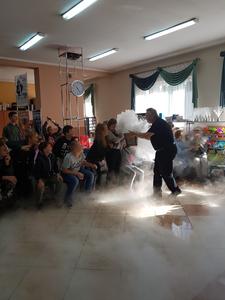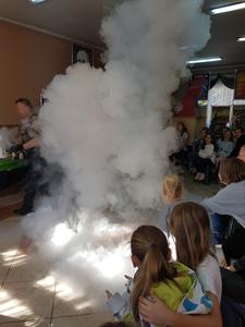 Pierwsza część warsztatów, to pokazy z ciekłym azotem. Ciekły azot, którego temperatura wynosi -196 C pozwala odczuć granicę zimna w okolicy temperatury zera krytycznego. Było dużo „dymu”, dużo wybuchów, które są następstwem wysokiej rozprężności ciekłego azotu. Każdy mógł dotknąć bardzo zimnej cieczy i przy okazji zobaczyć jak ciekły azot oddziałuje na otoczenie. Bananem można przybijać gwoździe. Z balona powstaje kawałek szeleszczącej folii. Róża zanurzona w ciekłym azocie i schłodzona o kilkaset stopni po wyjęciu diametralnie zmienia swoje właściwości fizyczne. Początkowo giętka i elastyczna roślina zamienia się w strukturę podobną do szkła. Rzucona na ziemię rozbija się na kawałki. Balonik z powietrzem zanurzony w ciekłym azocie zaczyna drastycznie się kurczyć ze względu na spadek ruchu cząsteczek we wnętrzu. Po wyjęciu balonika z azotu i ponownym ogrzaniu do temperatury pokojowej balonik wraca do pierwotnych rozmiarów.