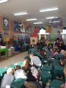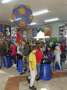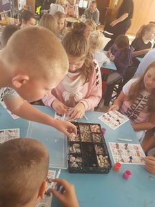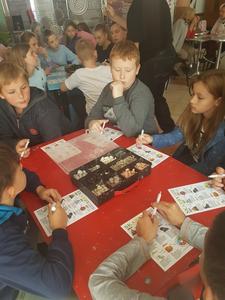Druga częśc naszych warsztatów, to zajęcia geologiczne. Są to zajęcia interaktywne z poznawania i rozróżniania skał i minerałów występujących na naszej planecie. Każdy mógł zobaczyć, dotknąć, poznać właściwości skał oraz namacalnie samemu je przykleić do tablicy z zestawem minerałów. Zobaczyliśmy jak ostry jest krzemień, jak czarny jest obsydian, jak zbudowany jest granit i jak kruchy jest piaskowiec. Sprawdziliśmy jak wygląda gnejs czy marmur. Można także porównać takie same kryształy górskie, jednak każdy z nich ma inny kolor – od żółtego cytrynu, przez fioletowy ametyst do czarnego moriona.