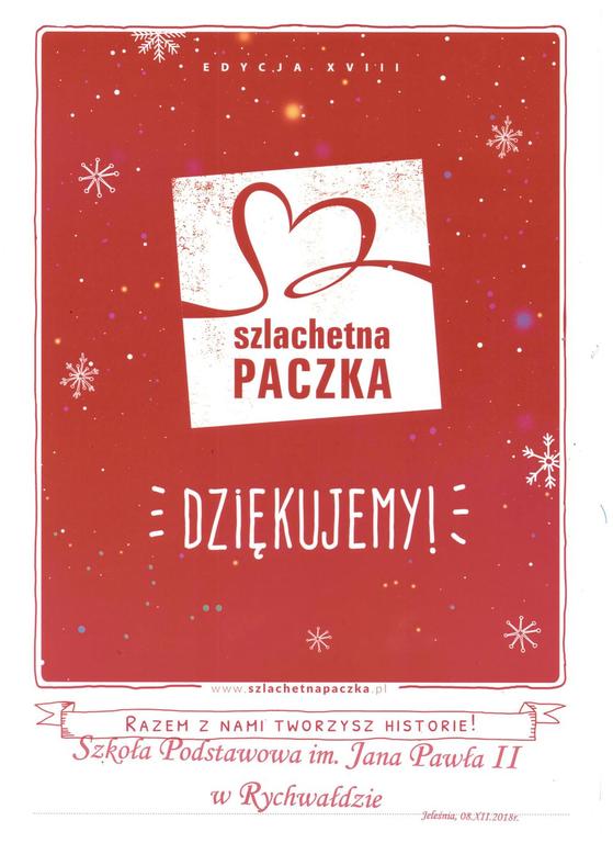 Bardzo serdecznie dziękuje za miłą i jakże wspaniałą współprace. Paczki dotarły szczęśliwie i wszystko było jak należy, jeszcze raz bardzo serdecznie dziękuje. Pomoc jaką przygotowaliście Państwo dla rodziny ogromnie mnie wzruszyła. Życzę zdrowych, spokojnych świąt spędzonych w radosnej, rodzinnej atmosferze, szczęśliwego Nowego 2019 Roku. Zachęcam gorąco do udziału w kolejnych edycjach projektu Szlachetnej Paczki. |