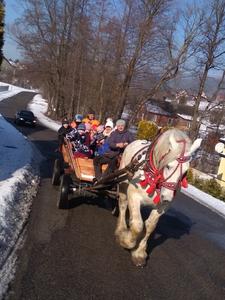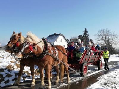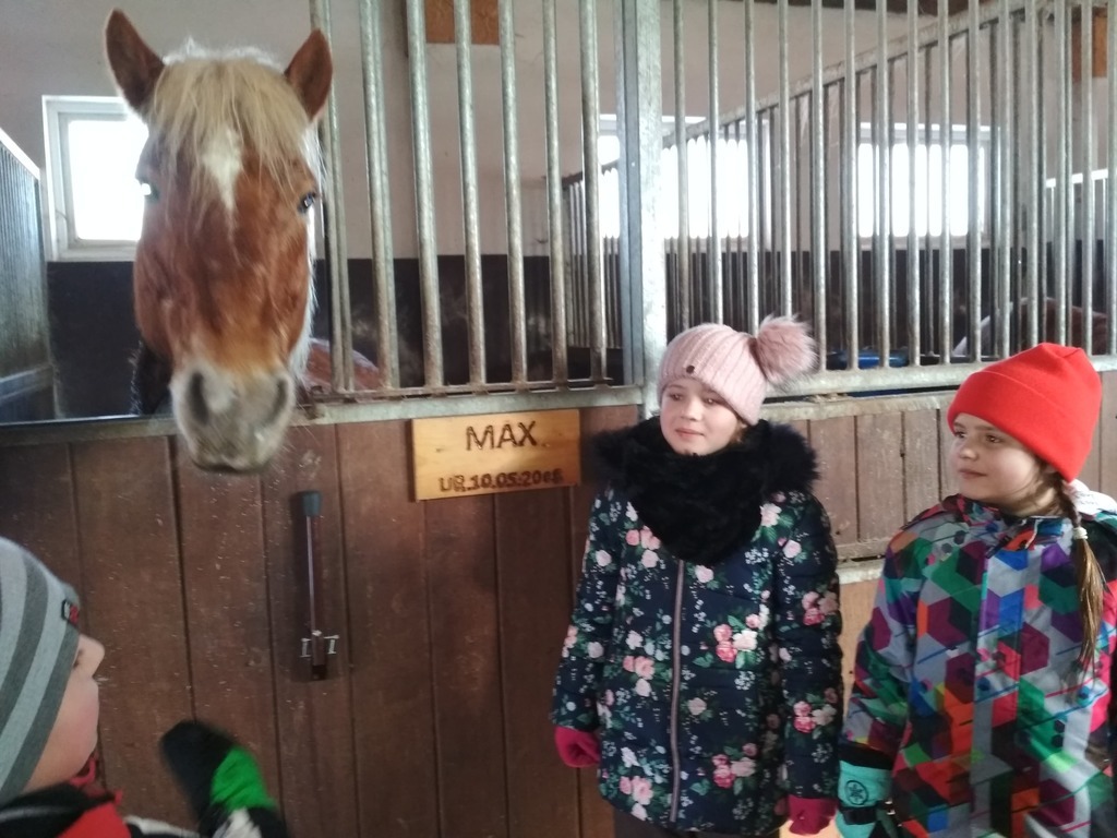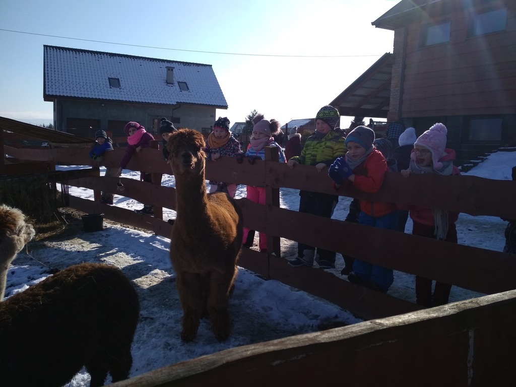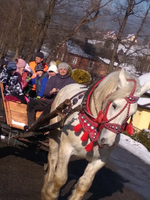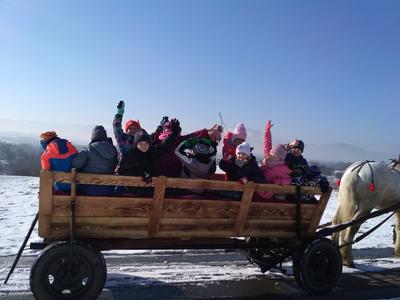 We wtorek 5 lutego klasy 1-3 wybrały się na kulig do Biernej. Po ostatnich ponurych dniach, dzisiejsza pogoda była jak na zamówienie. Śnieg skrzypiał pod nogami, słońce ogrzewało uśmiechnięte twarze, a dzwonki wesoło dzwoniły. W takiej cudownej atmosferze spędziliśmy całe przedpołudnie. Zabawy było co niemiara. Oprócz przejażdżki wśród pięknej zimowej scenerii, mieliśmy okazję zwiedzić mini ZOO pełne koni różnej rasy. Były też kozy, alpaki i kangur, wszystkie z niekończącym się apetytem. Żeby jak najlepiej wykorzystać tą cudowną zimową pogodę, zjeżdżaliśmy z górki na pazurki, a ubaw był przy tym po pachy. Po tylu atrakcjach trzeba było uzupełnić zapasy energii w szałasie z pyszną kiełbaską i ciepłą herbatą. Oj żal było wracać, ale to nam dało motywację do organizacji kolejnych wspólnych wypadów..