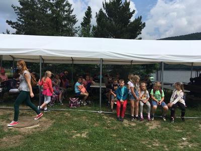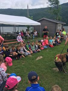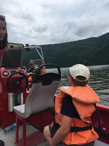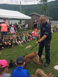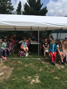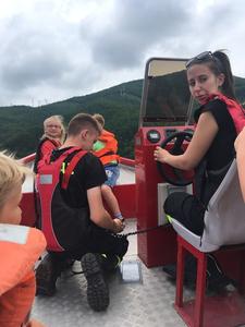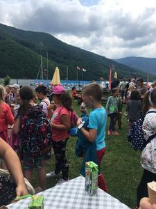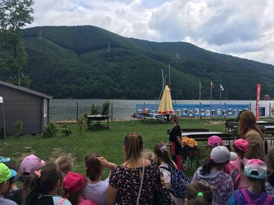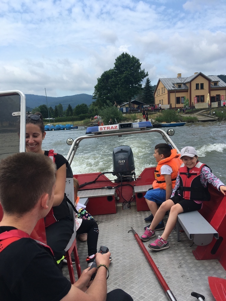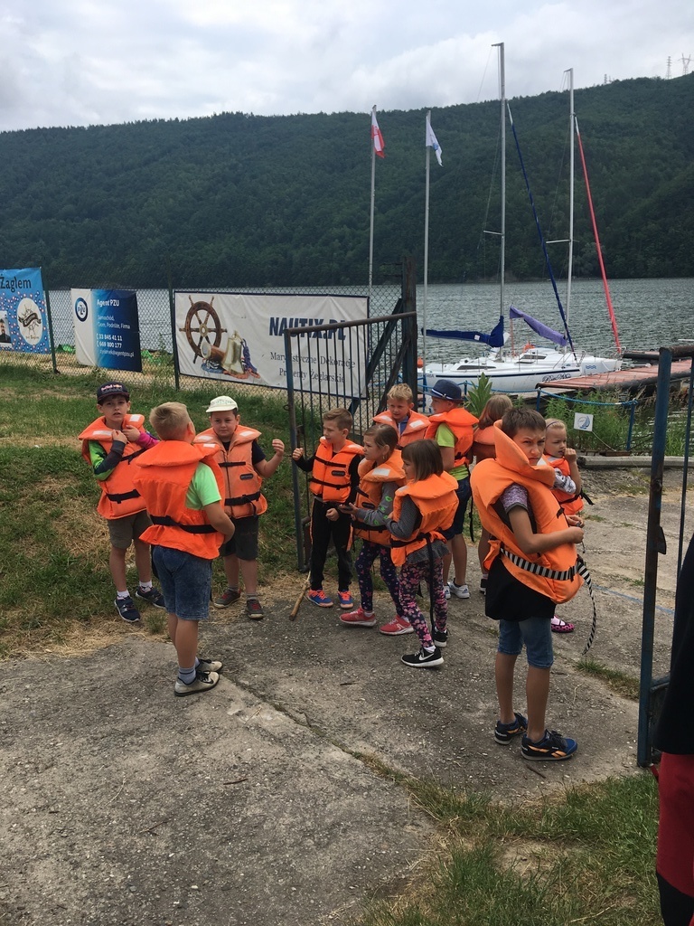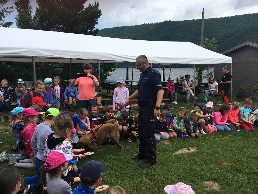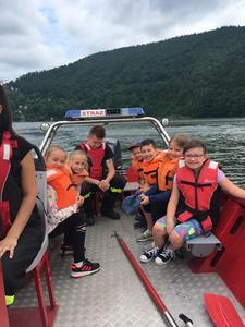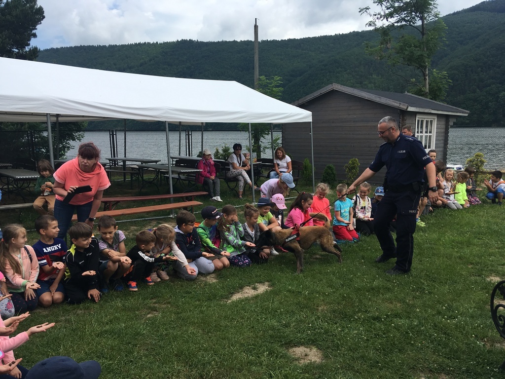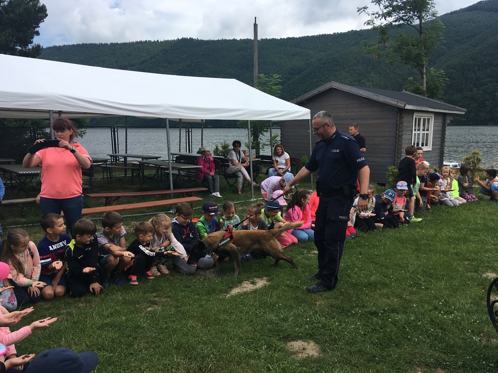 Uczniowie najmłodszych klas odbyli w dniu 17 czerwca 2019 r. lekcję bezpieczeństwa w bardzo atrakcyjnym miejscu. Zajęcia rozpoczęły się przejażdżką motorówkami służb bezpieczeństwa po Jeziorze Żywieckim (jednostki straży pożarnej, policji i straży rybackiej). Była to nie lada atrakcja dla uczniów. Na lądzie dzieci brały udział w pogadance na temat bezpiecznego zachowania w różnych sytuacjach. Policjant zwrócił uwagę na to, że bezpieczeństwo zależy przede wszystkim od nas samych. Obył się pokaz tresury psa policyjnego i każde dziecko miało możliwość nakarmienia czworonoga z ręki. Pies w mgnieniu oka pałaszował karmę wystawioną na dłoniach dzieci. Na koniec uczniowie otrzymali dyplomy i książeczki o bezpieczeństwie i słodkie upominki - soczki i lody. W radosnym nastroju powróciliśmy do szkoły. Dziękujemy serdeczni naszej dzielnicowej Pani Renacie Klimczak za pomoc w organizacji wyjazdu naszych uczniów na wspaniałe zajęcia oraz Pani Kamili Urbaniec przewodniczącej GKRPA za sfinansowanie ze środków komisji książeczek, dyplomów i słodkiego poczęstunku.
