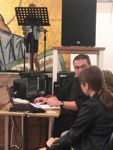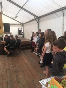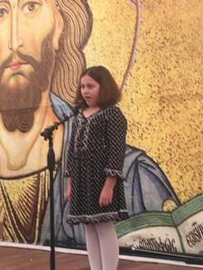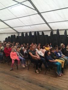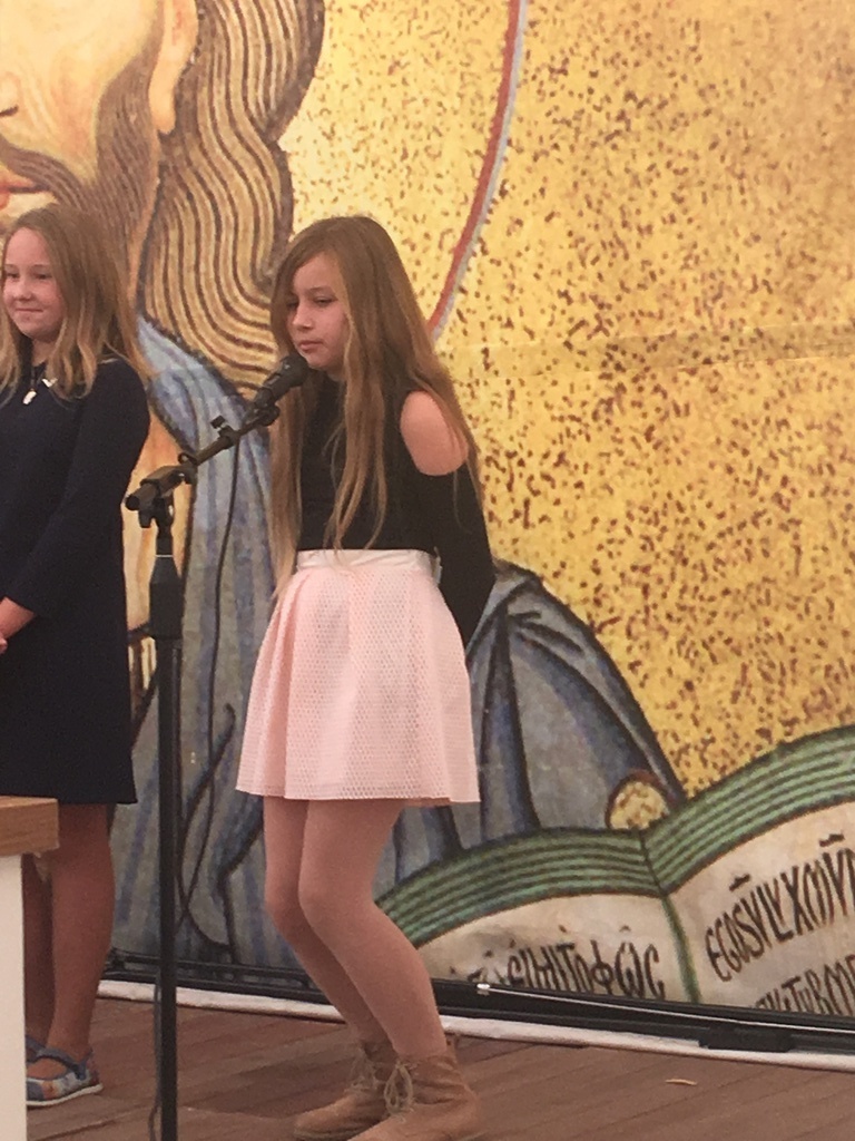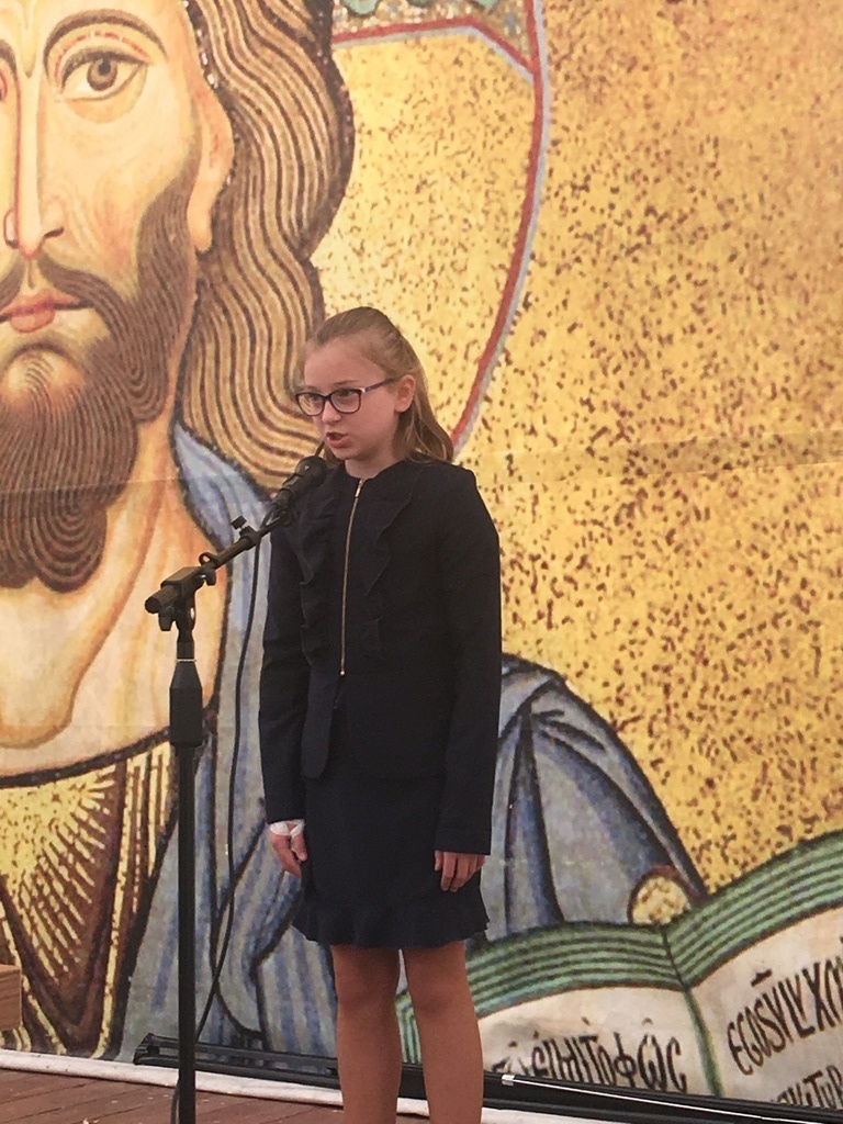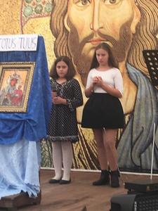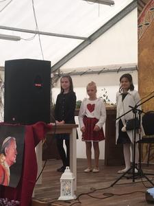 W pierwszej części miał miejsce montaż słowno-muzyczny w wykonaniu uczniów klasy VI B pt. „Wstańcie, chodźmy” nawiązujący do hasła tegorocznego XIX Dnia Papieskiego obchodzonego w całej Polsce w niedzielę 13 października. Uczniowie pokazali, że historia apostołów z Ogrodu Oliwnego ciągle trwa, przenosi się tylko w inne miejsca i przywdziewa różne szaty…. W historię tę wpisują się tacy ludzie jak Jan Paweł II, którzy jak drogowskazy pokazują właściwą drogę. W czasie montażu wysłuchaliśmy utworów skomponowanych specjalnie dla Jana Pawła II. Przeżyliśmy moc wypowiadanych przez samego papieża słów na Placu Zwycięstwa w Warszawie w 1979r. Miało to miejsce dokładnie 40 lat temu, a brzmiały tak: ” Niech zstąpi Duch Twój”. Mali aktorzy zaprezentowali się bardzo dobrze. Na podkreślenie zasługuje występ Filipa Wróbel, który wcielił się w postać Jezusa i Jana Pawła II. W dziecięcym przekazie, słowa Papieża brzmiały równie autentycznie i mocno: „ Wy, drodzy młodzi nie lękajcie się głosić Chrystusa w każdej sytuacji.”