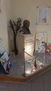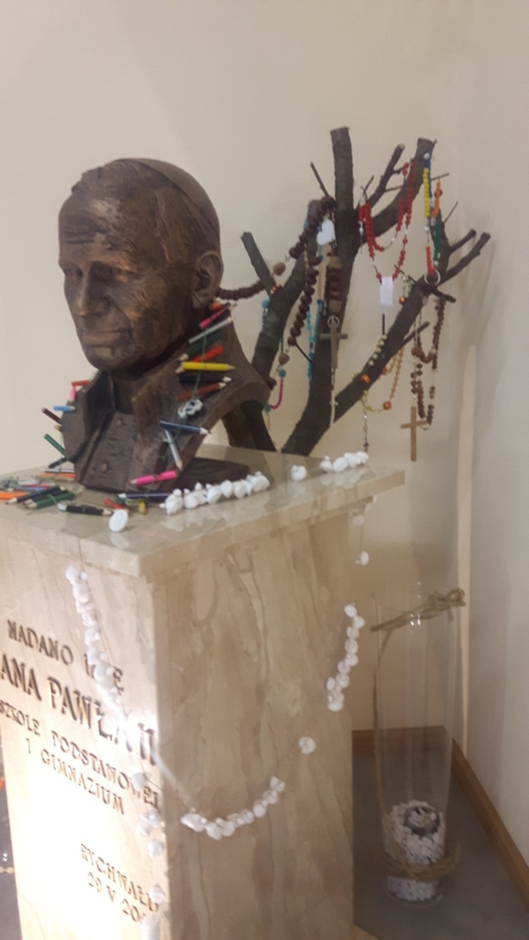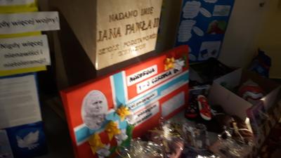 W miesiącu październiku trwaliśmy na modlitwie różańcowej zarówno w kościele, w domu, w drodze do lub z pracy. Wielu za Janem Pawłem II podkreśla, że to ich ulubiona modlitwa, najbardziej owocna w łaski. Aby o tym przypomnieć uczniom w naszej szkole został zorganizowany konkurs pt. „Z czego można zrobić różaniec?”. Jak się okazało, wśród uczniów byli tacy ( 12 osób),którzy nie opuścili nabożeństwa różańcowego i przez 31 dni uczestniczyli w tej modlitwie. Ogłoszony przez katechetów konkurs cieszył się dużym zainteresowaniem. Z każdym dniem w kąciku patrona szkoły pojawiały się nowe okazy, które zachwycały i przyciągały uwagę całej społeczności szkolnej.