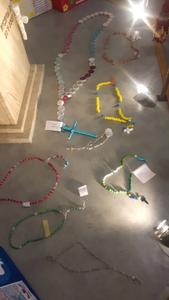 Wielu uczniów w wykonanie różańca zaangażowało całe rodziny. Prace były bardzo przemyślane, dokładnie wykonane i oryginalne. Różańce wykonane były z naturalnego materiału takiego jak: fasola, makaron, kasztany, żołędzie, pestki dyni, wosk, a nawet popcorn. Zainteresowanie, zwłaszcza dzieci wzbudzały różańce wykonane z klocków Lego, z jajek niespodzianek, kredek i mini cukierków. Tradycyjne różańce z koralików, były starannie nawinięte na linkę lub sznurek i zachowywały wzorowe proporcje. Jeszcze inne okazy zamiast koralików na nitce lub tasiemce prezentowały drobniutkie różyczki, pomponiki, guziki, a nawet śrubki.