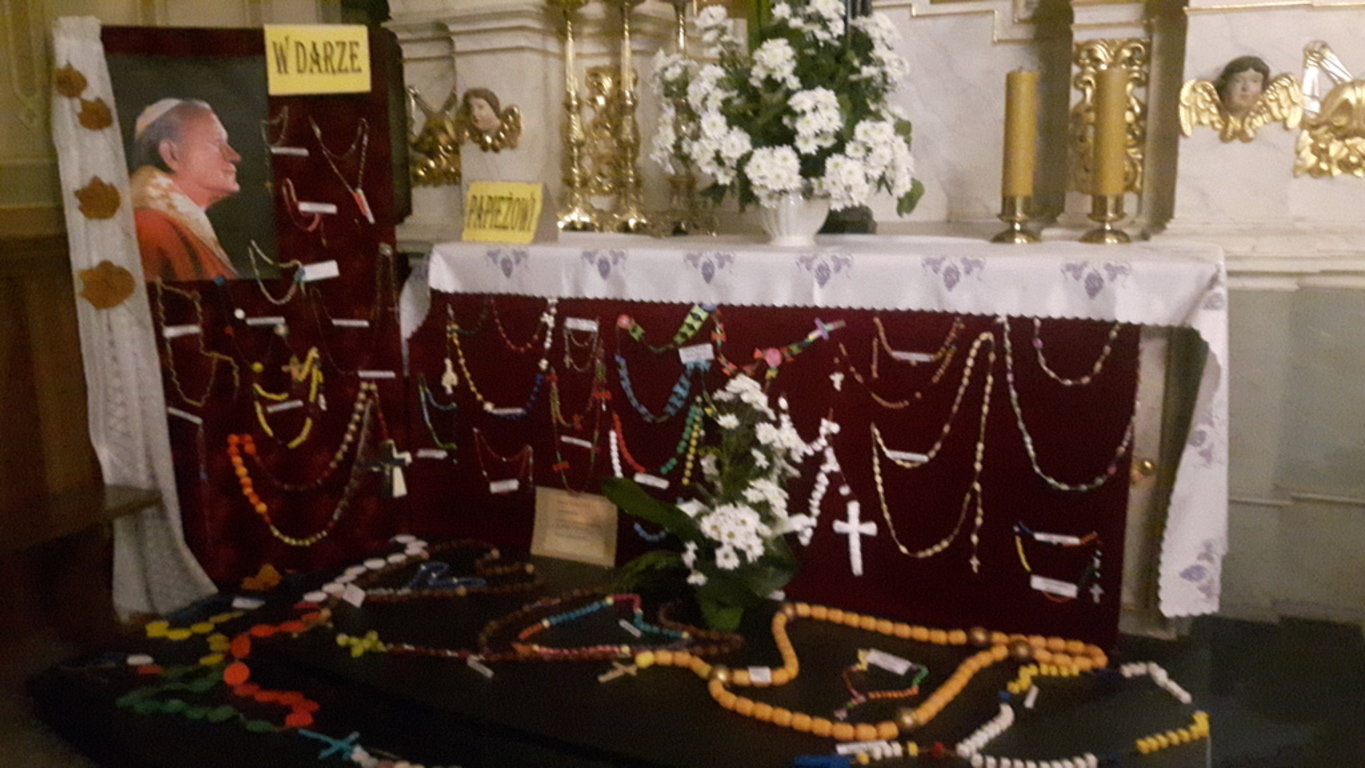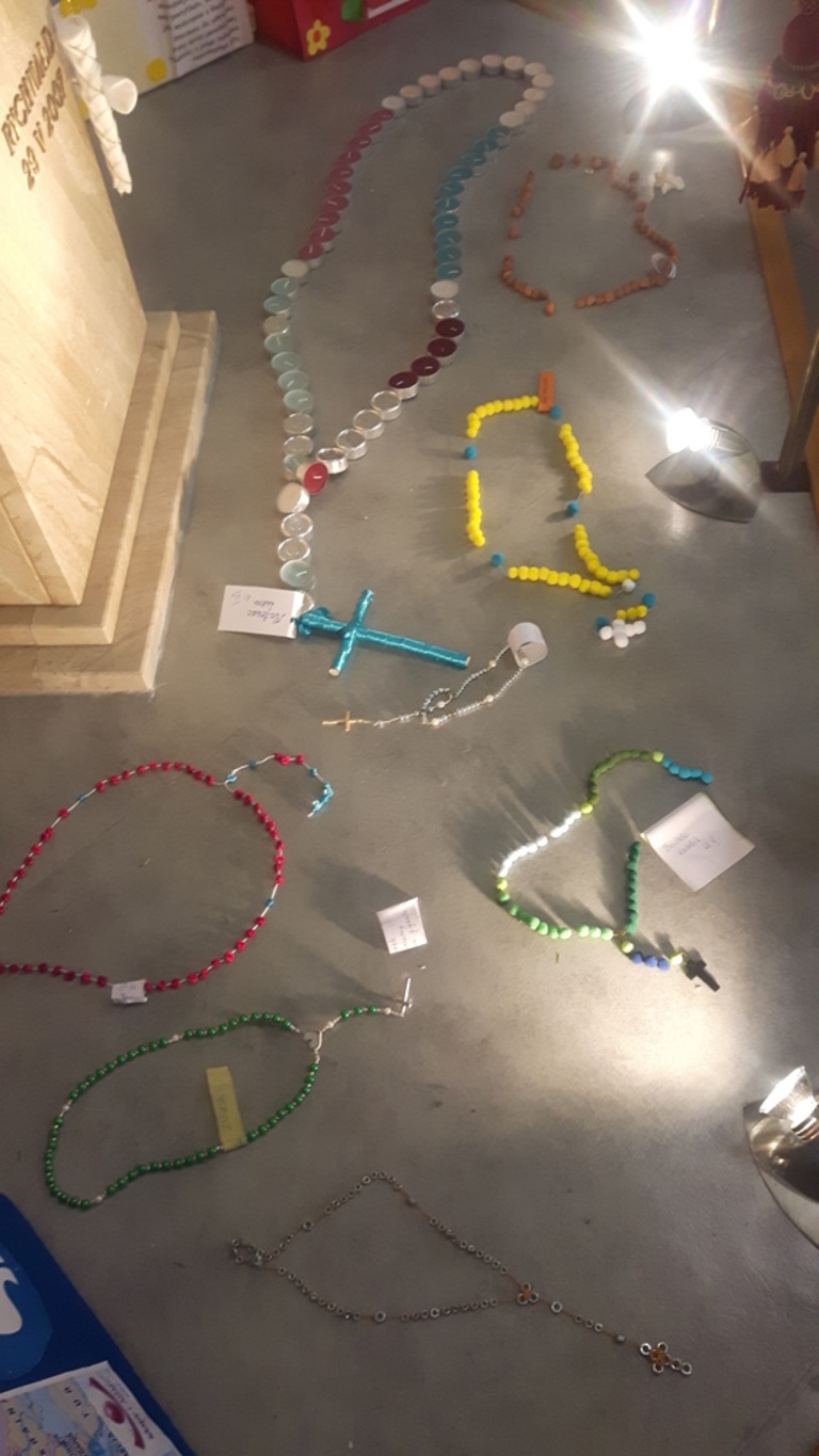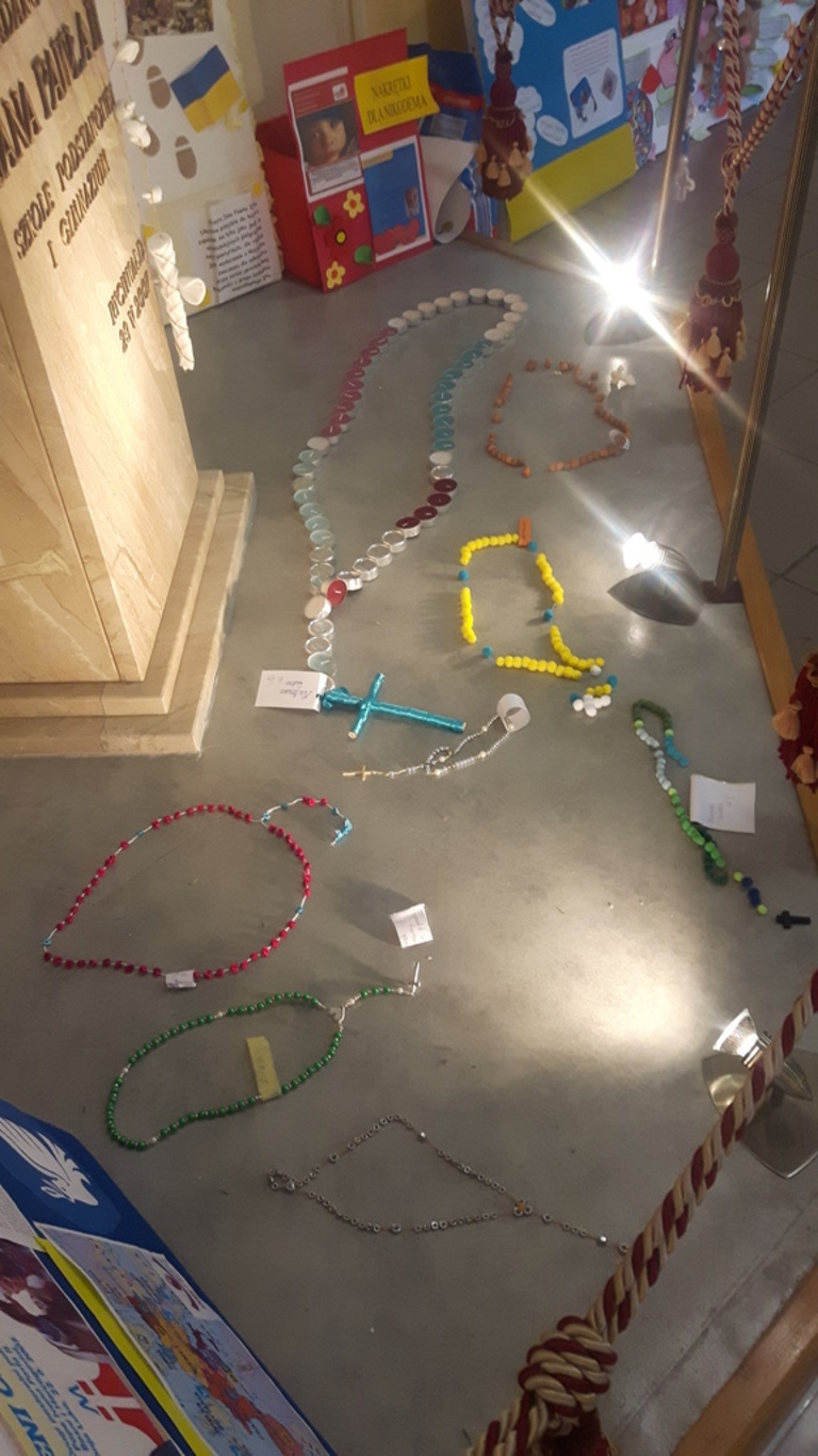 Twórcze pomysły można było podziwiać również w kościele parafialnym, gdzie zorganizowałam wystawę prac. Wyłonienie zwycięzcy okazało się niemożliwe, gdyż każdy różaniec pomimo przyjętych kryteriów miał w sobie swoją wartość, której nie dało się zamknąć w ocenie. Zarówno nauczyciele, przedstawiciele samorządu uczniowskiego, jak i jury powołane z członków rady parafialnej uznali, że należy wszystkie prace nagrodzić.