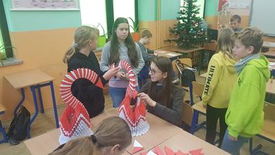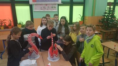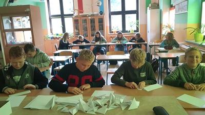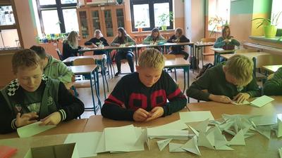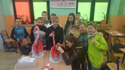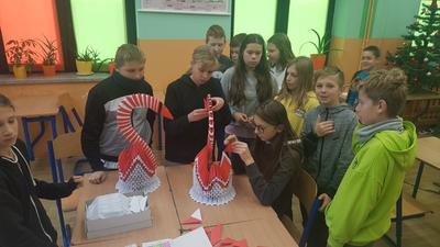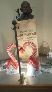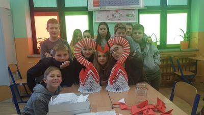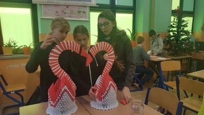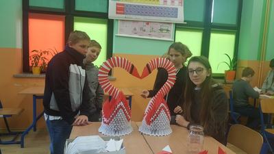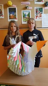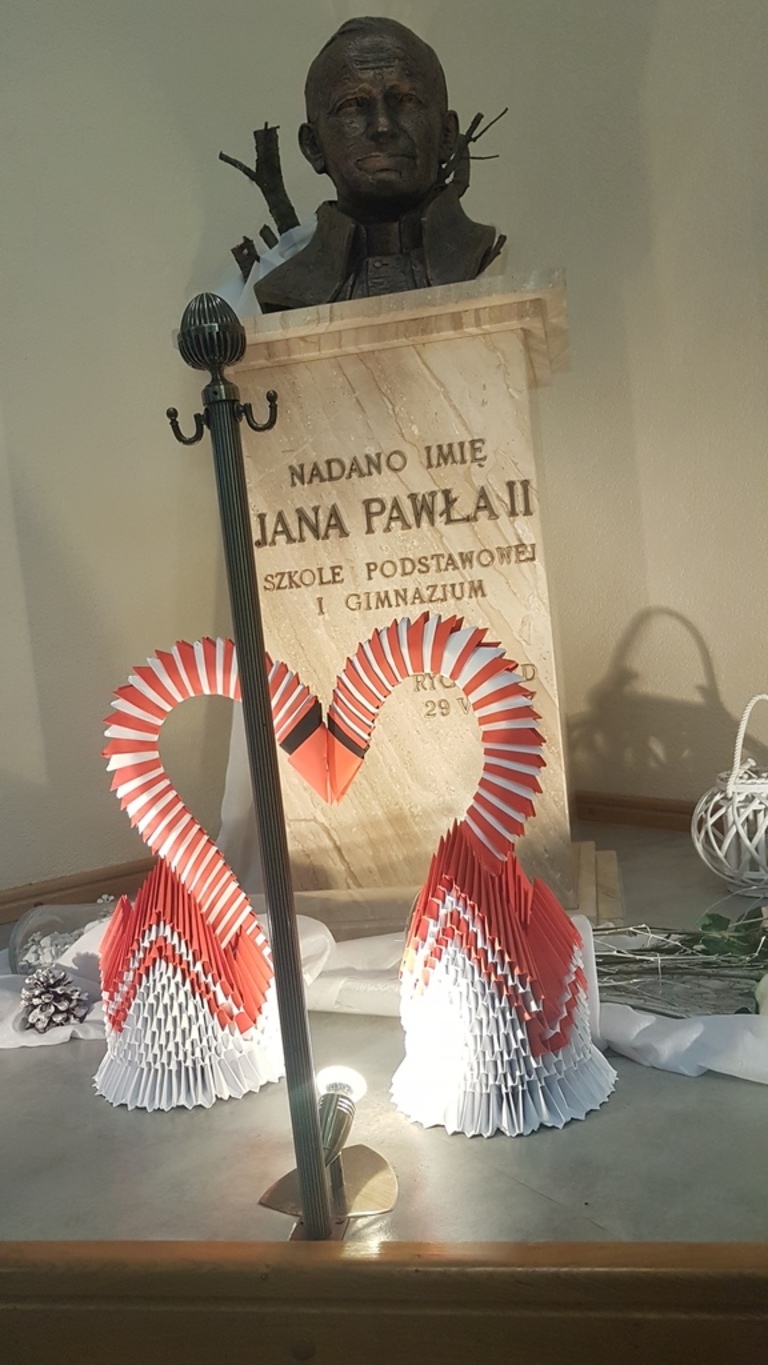 Na zajęciach z kreatywności poznawaliśmy tajniki sztuki origami. Uczyliśmy się składać tzw. moduł chiński. Naszym założeniem było, aby powstały dwa łabędzie, które złączone szyjami, będą tworzyć serce. Zajęcia wymagały od uczniów cierpliwości, dokładności, wytrwałości, precyzji…… Złożyliśmy 978 modułów! Po kilku tygodniach cel został osiągnięty. Stworzyliśmy piękne łabędzie. Klasa VIa postanowiła ofiarować swoje dzieło Patronowi Szkoły Janowi Pawłowi II, jako dar owocnej i zgodnej współpracy w grupie.
