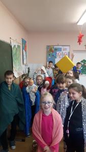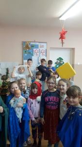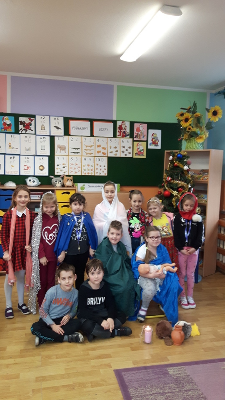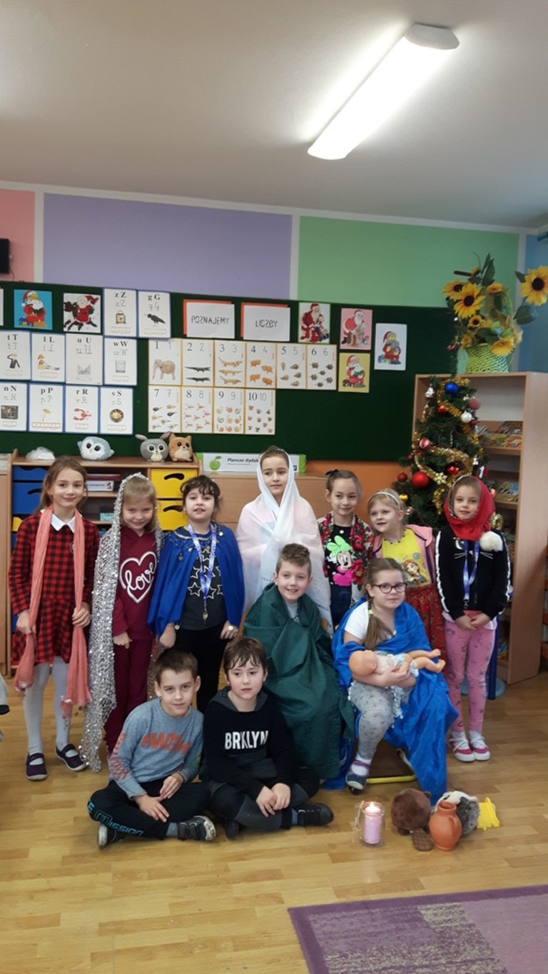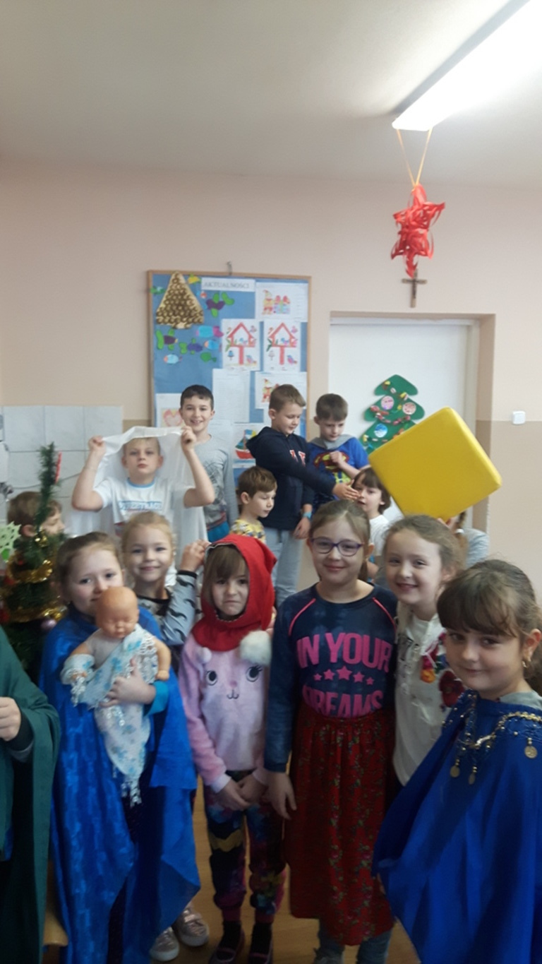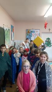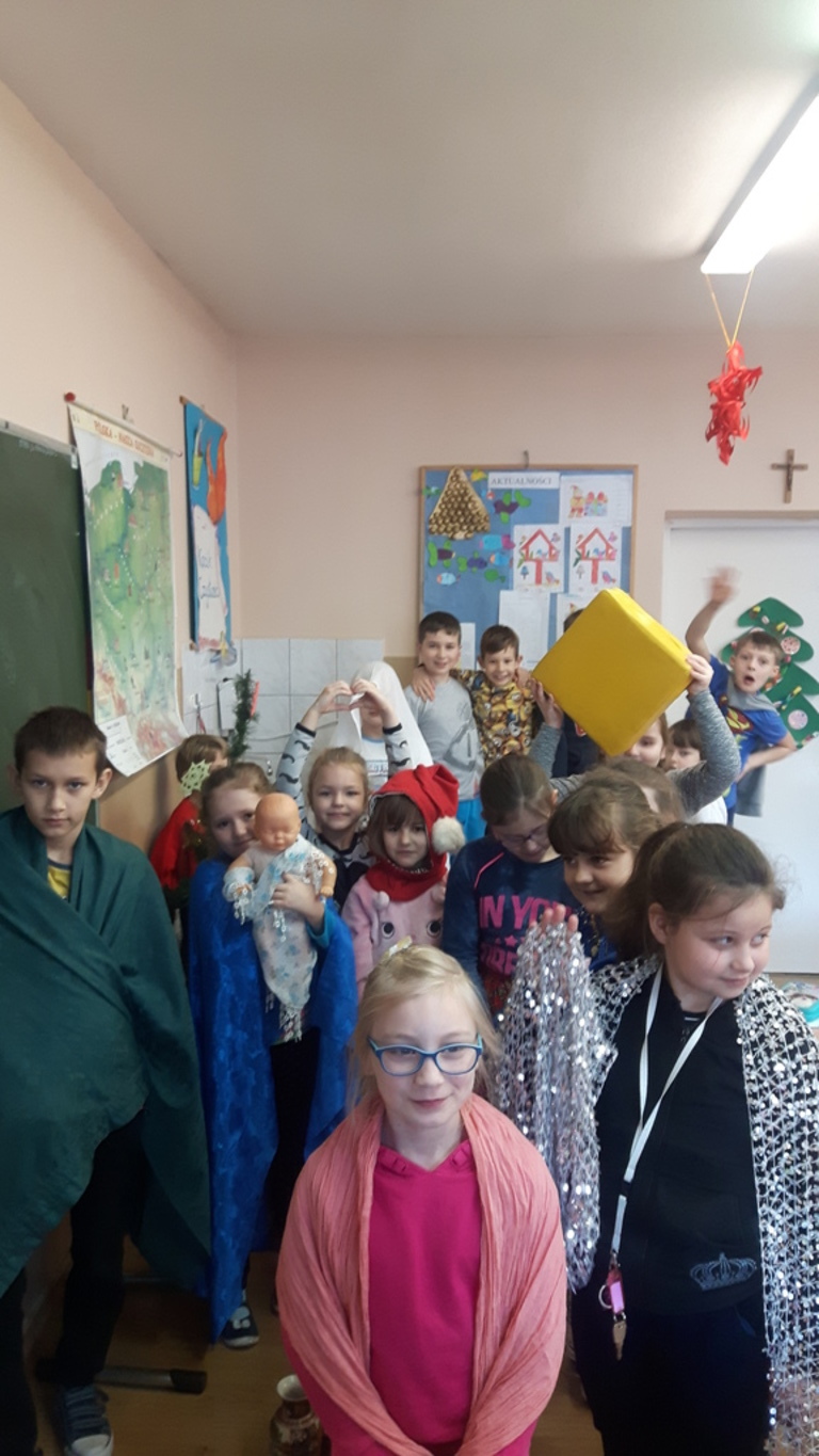 - W przeżywanie świąt Bożego Narodzenia społeczność szkolną wprowadziło przedstawienie przygotowane pod kierunkiem P. Urszuli Ostrowskiej. Ukazało ono sedno Bożego Narodzenia, gdyż człowiek obdarowany prezentem- niespodzianką nie zatrzymywał go dla siebie, ale postanawiał ofiarować go innym. Czyn ten sprawiał, że serca ludzkie przemieniały się, a w nich rodziła się miłość, radość, pokój- to co przynosi małe Dziecię Jezus.