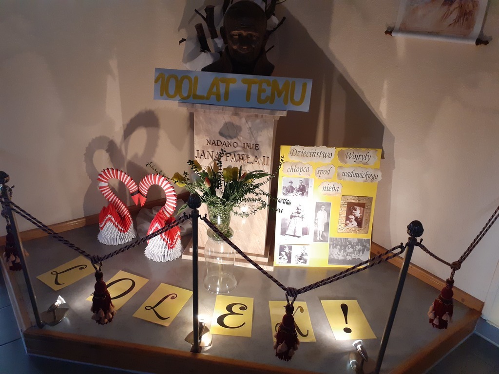 W tym roku podjęliśmy wiele inicjatyw, aby uczcić setną rocznicę urodzin Jana Pawła II przypadającą 18 maja 2020roku. Zaplanowaliśmy różne działania m.in. prowadzimy księgę dobrych uczynków, organizację Gminnego Konkursu Wiedzy o Janie Pawle II i konkursu recytatorskiego dla uczniów klas I-III, uroczystą Eucharystię w naszej bazylice…
