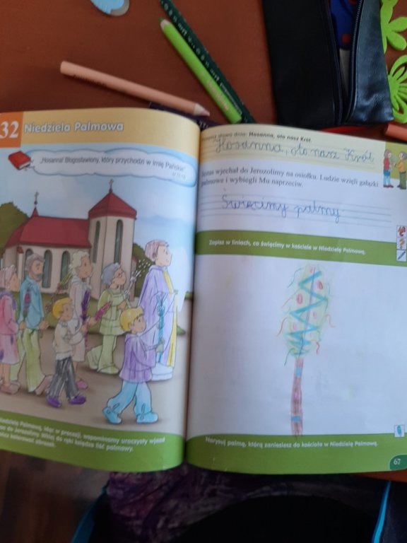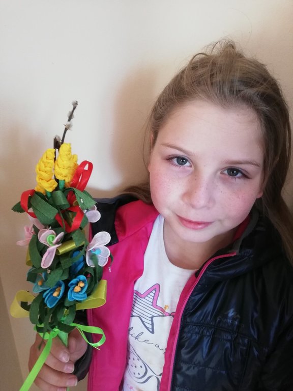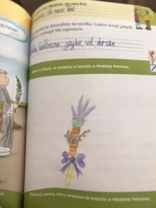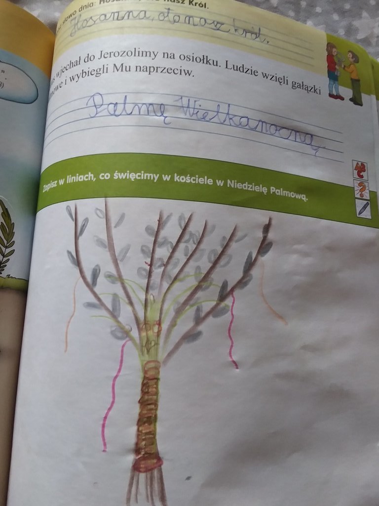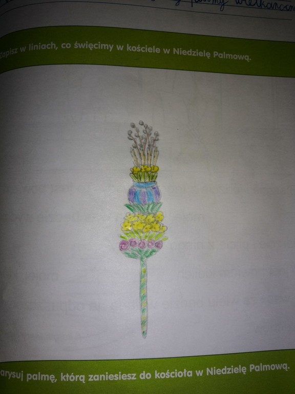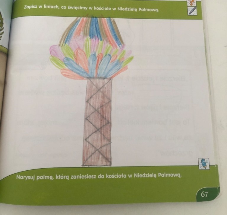 Szczególnie dziękuję rodzicom i uczniom klasy II za przesłanie zdjęć wykonanych przez dzieci palm. Zarówno te wykonane z darów natury jak i te namalowane kredkami są symbolami naszej wiary i kultywowania tradycji przodków. Palmy przechowujemy przez cały rok, aby strzegły domu od nieszczęść i zapewniały błogosławieństwo Boże. Dawniej wynoszono je także na pola, aby Pan Bóg strzegł zasiewów i plonów przed gradem, suszą i nadmiernym deszczem. W moim rodzinnym domu gałązki palmy palono również w czasie burzy.