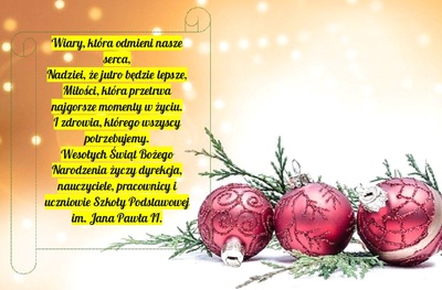 Najserdeczniejsze życzenia z okazji Świąt Bożego Narodzenia. Zdjęcia Zobacz również Anielskie śpiewanie dla Jana Pawła II... ŚWIĘTO PATRONA SZKOŁY. Chwała Bohaterom - 11 Listopada - Święto Niepodległości. Najserdeczniejsze życzenia z okazji Świąt Bożego... Wielka Fabryka Elfów w Katowicach BĄDŹ ŚWIATEŁKIEM DLA INNYCH… 23 grudnia 2021 Aktualności Wydrukuj Udostępnij Wyświetlono: 126