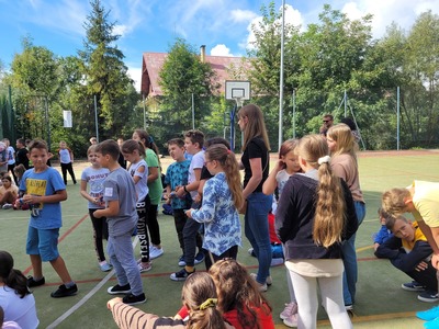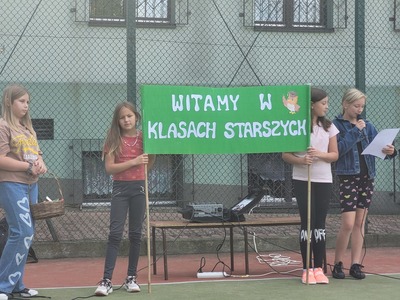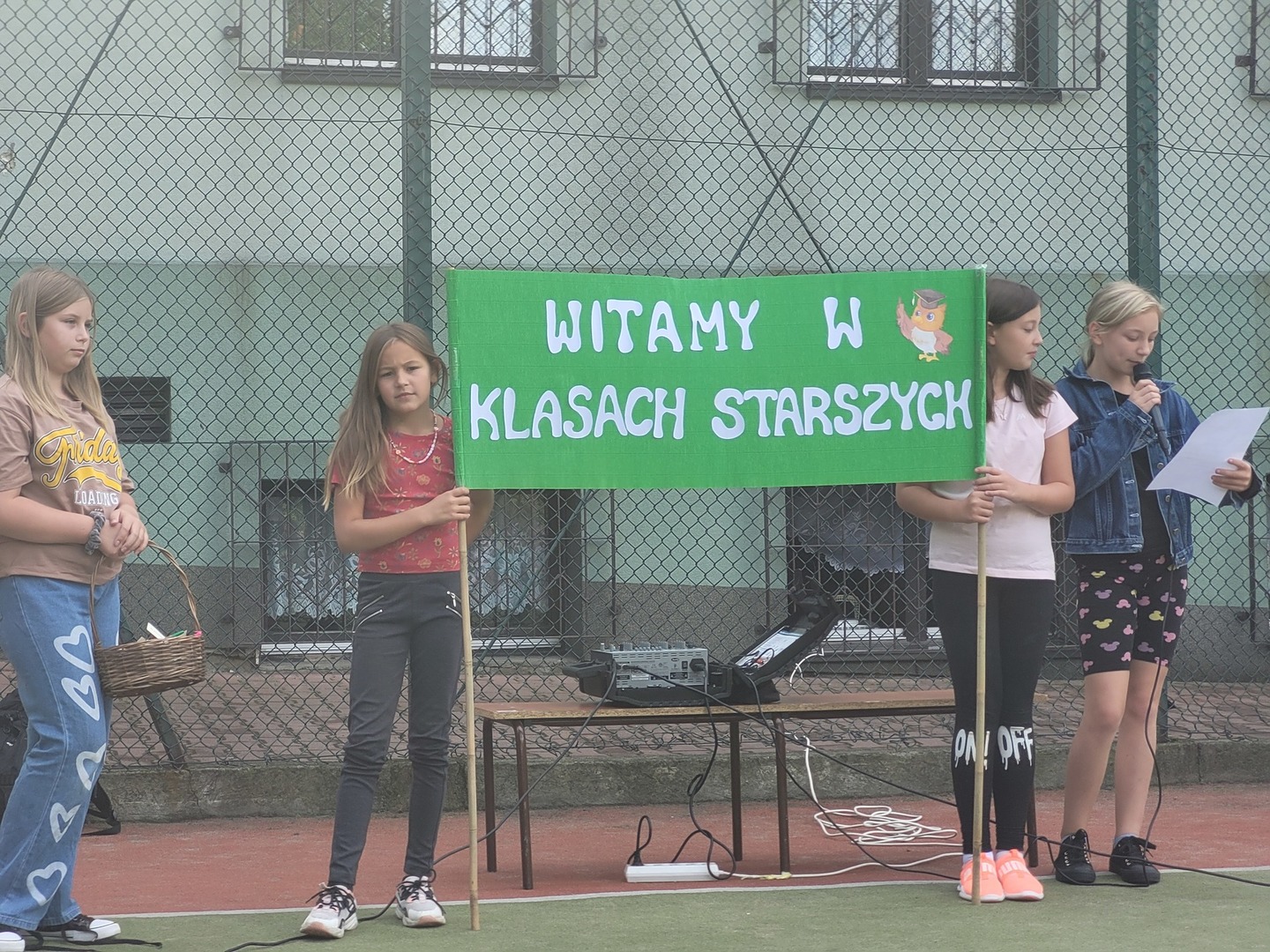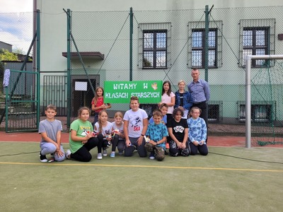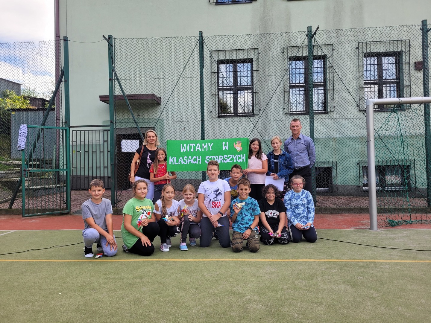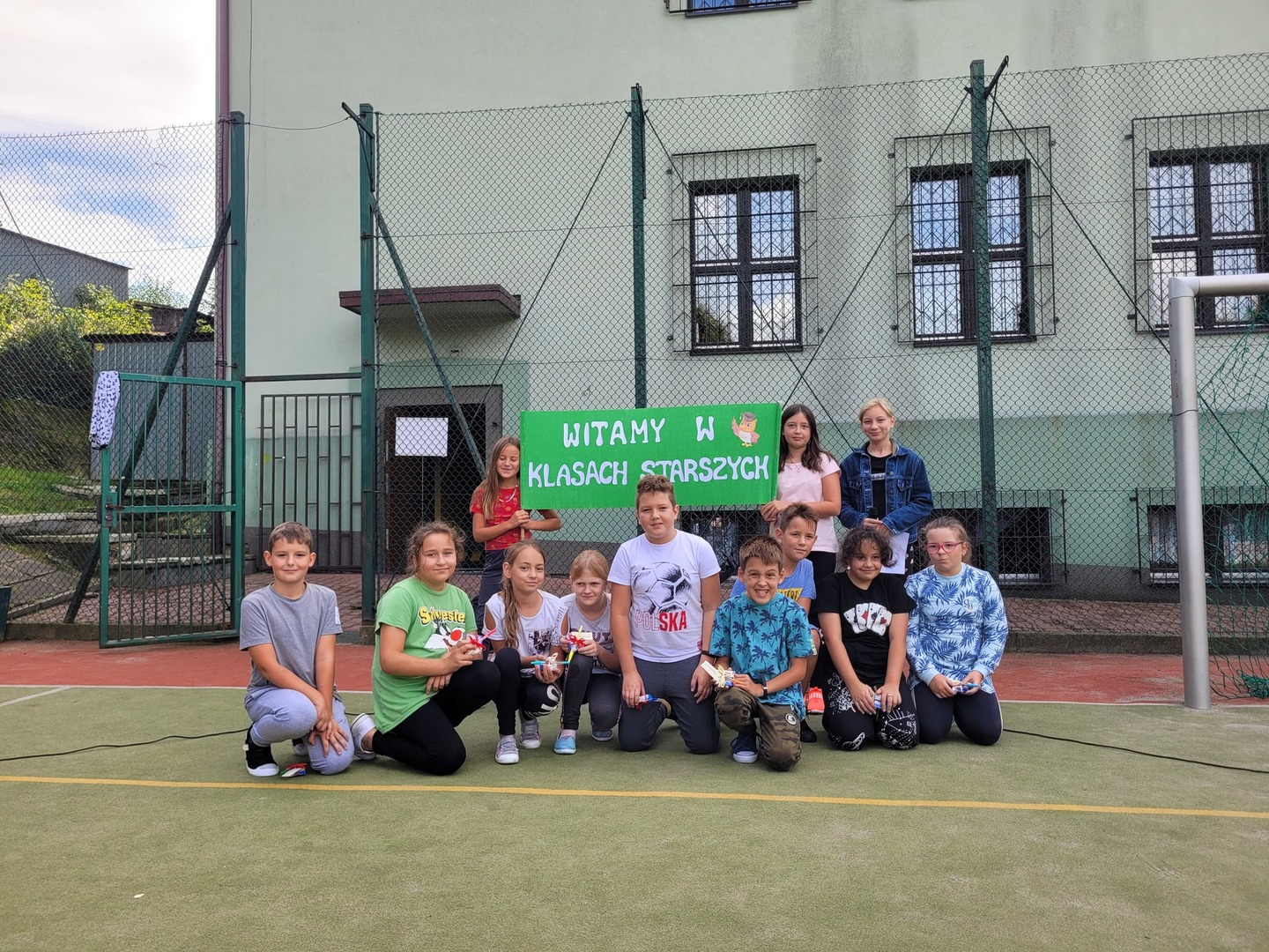 W piątek 9 września miało miejsce oficjalne powitanie czwartoklasistów w gronie uczniów klas starszych. Inicjatorami tej idei byli uczniowie klasy piątej wraz z wychowawczynią, Panią Kingą Siwek. Piątoklasiści wykonali powitalny transparent, uroczyście przywitali uczniów klasy czwartej wśród "szkolnej starszyzny" i obdarowali ich słodkimi upominkami. Oj, byli czwartoklasiści mile zaskoczeni :-)