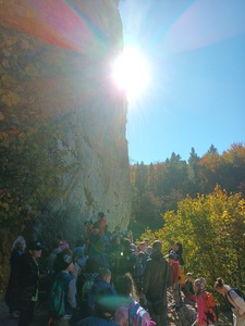 Kolejnym punktem wycieczki był przejazd do Ojcowa. Na trasie przejazdu można było podziwiać malownicze skałki i budowle m.in. Kaplicę na Wodzie. Nie małym wezwaniem okazała się wspinaczka na najwyższe wzniesienie w Ojcowskim Parku Narodowym - Górę Chełmową, aby na samym jej szczycie odkryć najdłuższą jaskinię - Grotę Łokietka. Wejście do niej i panujące w niej warunki były dużym przeżyciem. Zwiedzanie zakończyliśmy zejściem do potężnej bramy skalnej, zwanej Bramą Krakowską i przejściem wzdłuż rzeki Prądnik na parking, gdzie czekał na nas autokar. Bezchmurne niebo i jesienna aura sprawiły, że był to niezwykły dzień.