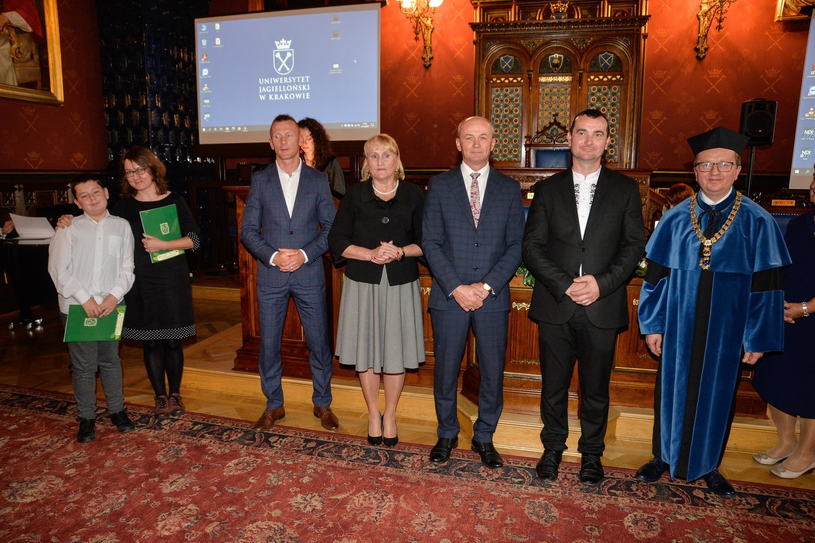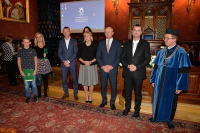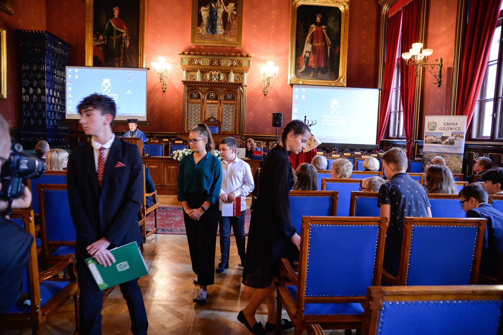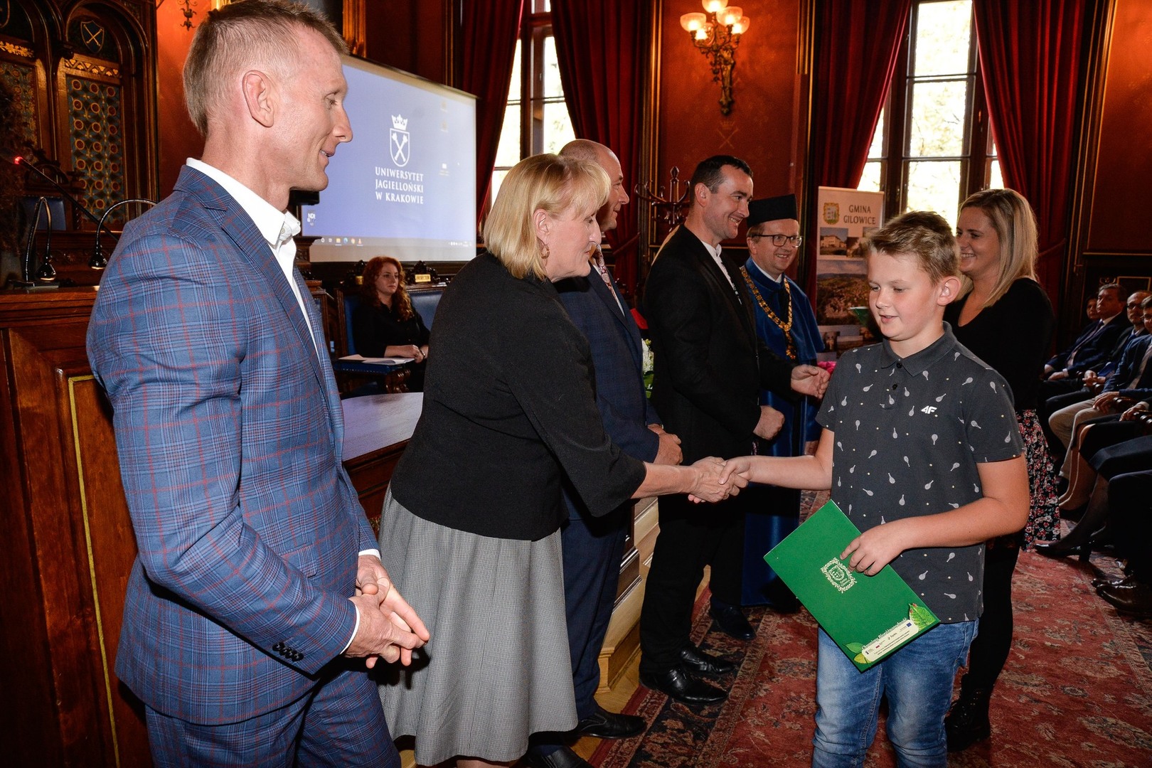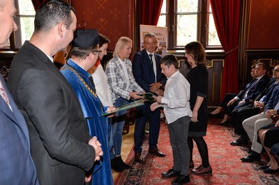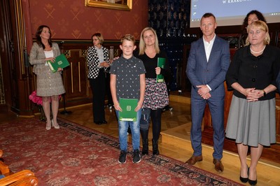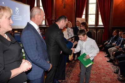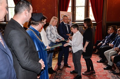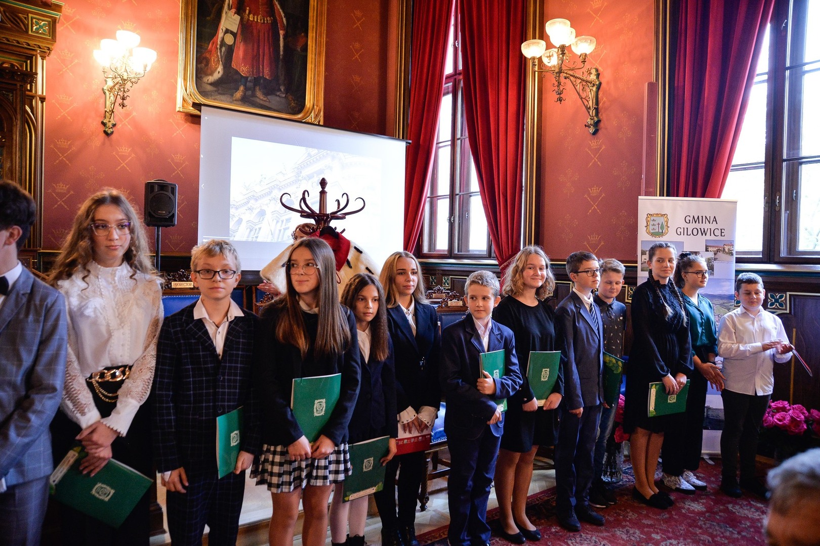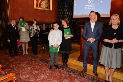 15 października czterech uczniów z naszej szkoły wraz z rodzicami uczestniczyło w niezwykłym wydarzeniu. Dzięki zaproszeniu Szkoły Podstawowej w Gilowicach wzięli oni udział w gali podsumowującej V edycję programu "Naprawdę warto się uczyć". Uroczystość odbyła się w Auli Collegium Novum na Uniwersytecie Jagielońskim w Krakowie. Hubert Barcik, Aleksandra Duc, Zuzanna Kastelik i Filip Sala za swoje osiągnięcia odebrali dyplomy, listy gratulacyjne i nagrody. Dodatkowo nagrody specjalne otrzymali: Aleksandra Duc - Nagrodę Dyrektora Szkoły Podstawowej im. Jana Pawła II w Rychwałdzie oraz Hubert Barcik - Nagrodę Rady Gminy Gilowice. Gratulujemy naszym uczniom wspaniałych wyników i życzymy dalszych sukcesów.