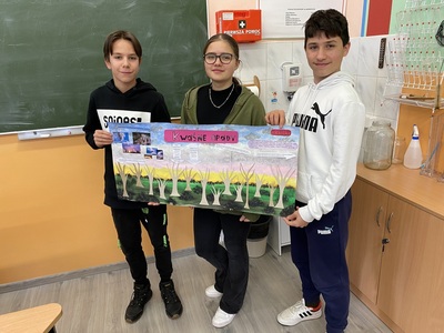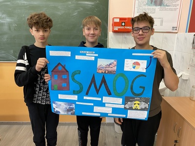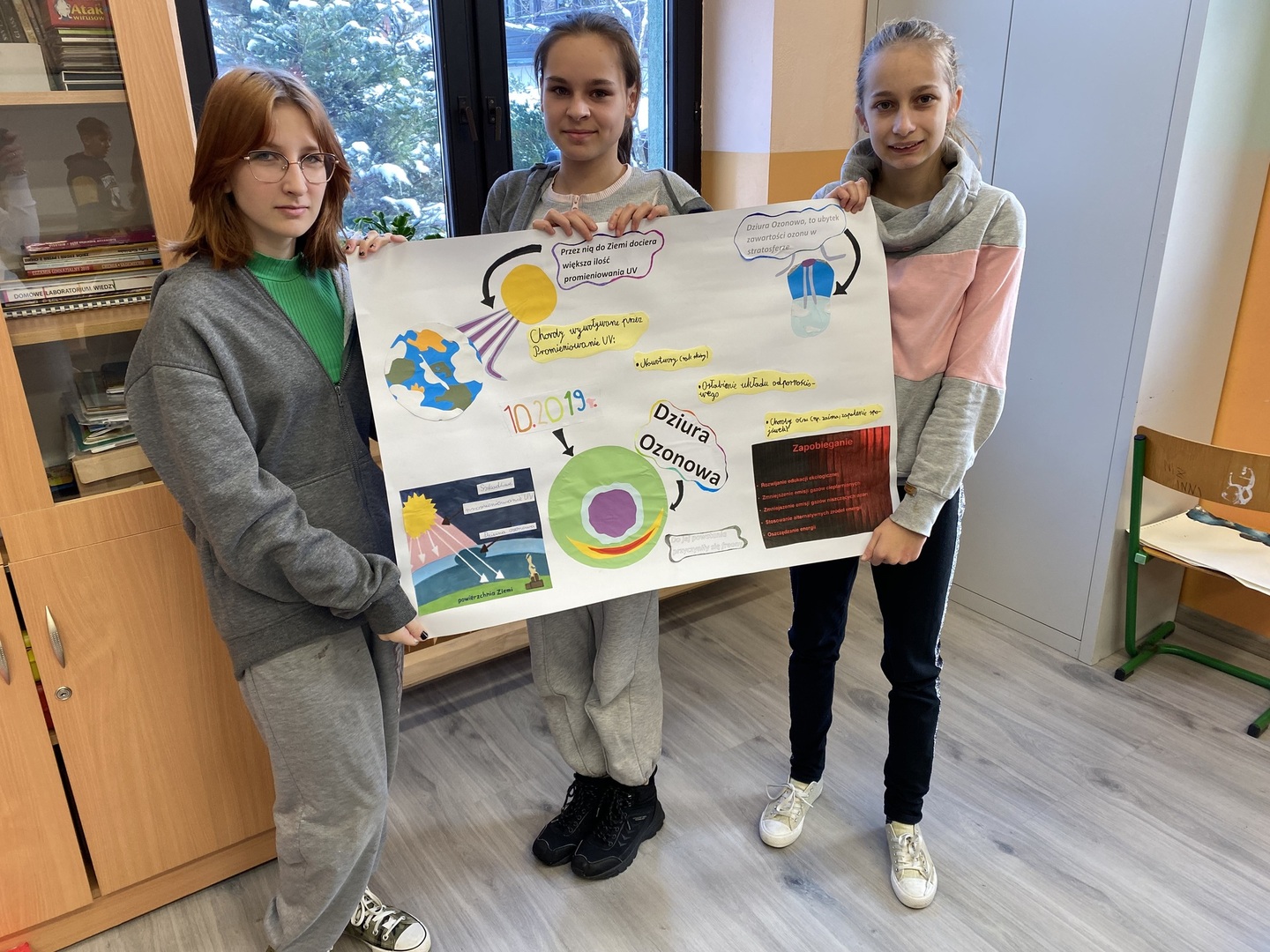 Uczniowie klasy VII na lekcji chemii przygotowali plakaty dotyczące zjawisk związanych z zanieczyszczeniami powietrza. Znajdziemy na nich informacje o przyczynach i skutkach smogu, dziury ozonowej oraz kwaśnych opadów. Aby przybliżyć tematykę młodszym koleżankom i kolegą plakaty znajdują się na korytarzu na pierwszym piętrze. Dbajmy razem o czyste powietrze!