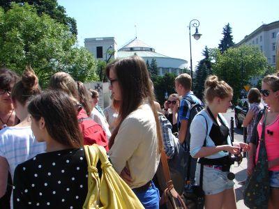 Pierwszym punktem programu było zwiedzanie Sejmu Rzeczpospolitej Polskiej. Podczas zwiedzania spotkaliśmy posłów z naszego regionu. Pani poseł Małgorzata Pępek oprowadziła naszą grupę po korytarzach Sejmu przekazując kilka ciekawostek związanych z organizacją pracy w Sejmie. Mieliśmy okazję przyjrzeć się pracy posłów, ponieważ właśnie w tym czasie toczyły się obrady i głos zabierał Minister Obrony. Zwróciliśmy uwagę na piękny bukiet kwiatów znajdujący się naprzeciw wejścia do budynku Sejmu. Jego obecność świadczy o toczących się obradach. W czasie, gdy Sejm nie obraduje, wazon jest pusty.