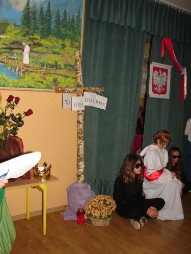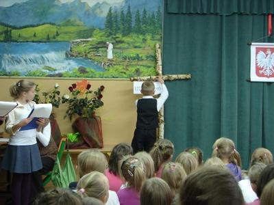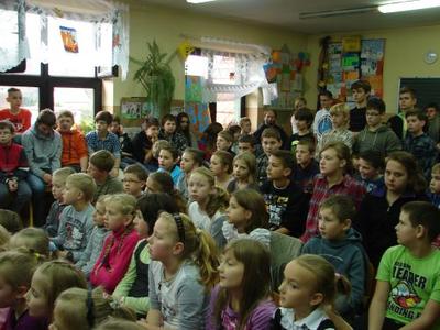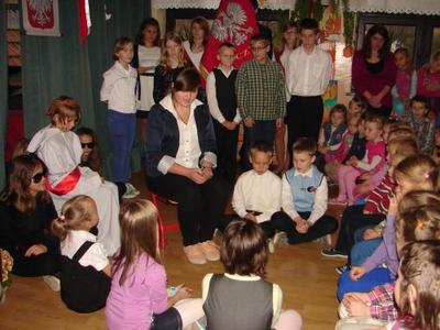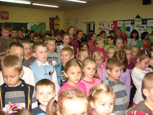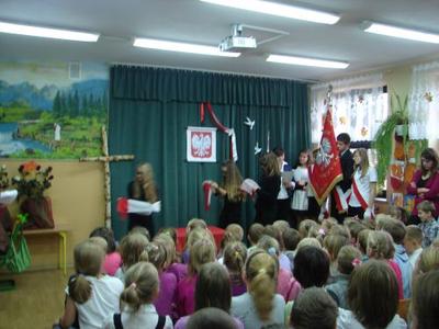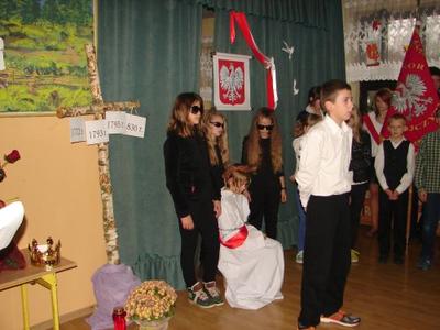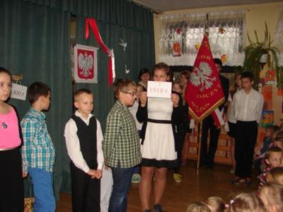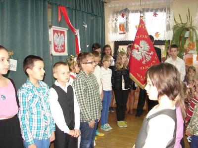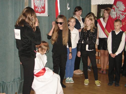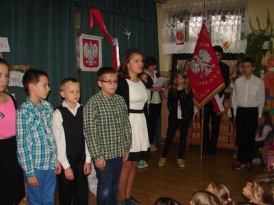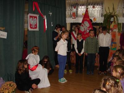 Z okazji Święta 11 Listopada pani Agnieszka Knapek wraz z uczniami klasy V przygotowała bardzo wzruszającą akademię. Uczniowie w skupieniu przypomnieli sobie dramatyczne wydarzenia z historii Polski. Rozdarta flaga Polski na 3 części to symbol rozbiorów, w których obce mocarstwa podzieliły nasz kraj między siebie, a Polska zniknęła z mapy świata na 123 lata. Występ swym pięknym śpiewem uświetniły uczennice klasy II gimnazjum Agnieszka Stasica i Patrycja Duc. Przedstawienie zakończyło się wspólnym odśpiewaniem Roty.