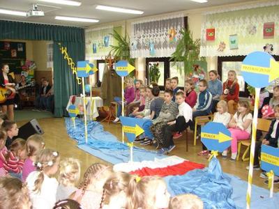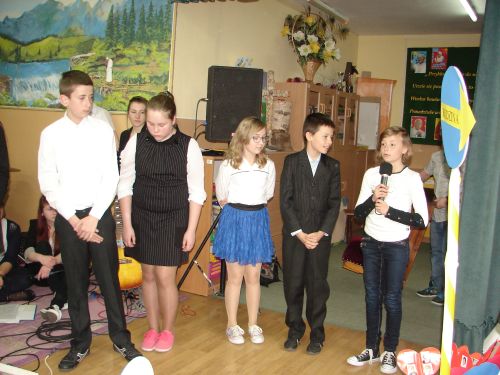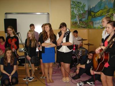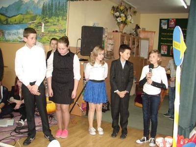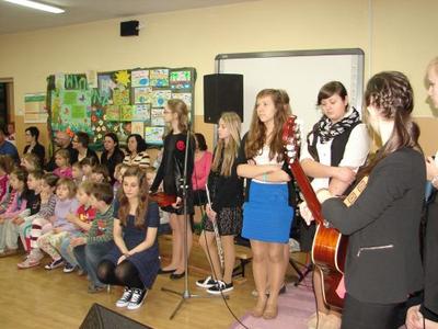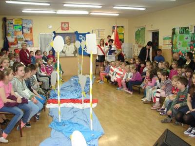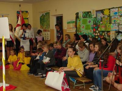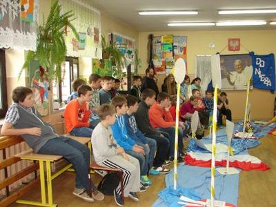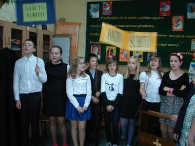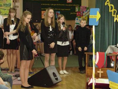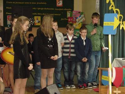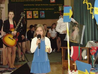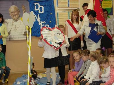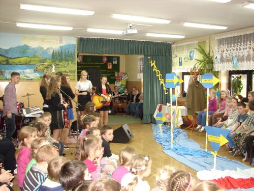 Pod takim hasłem odbyły się dzisiejsze uroczystości poświęcone kanonizacji Jana Pawła II naszego Wielkiego Patrona. Organizatorem obchodów była pani Dorota Walatek. Uczniowie wraz z nauczycielami od dwóch tygodni przygotowywali plakaty i rekwizyty obrazujące wartości, jakimi w DRODZE DO ŚWIĘTOŚCI kierował się Papież. Prezentacja przygotowanych przez poszczególne klasy "Drogowskazów do NIEBA" wzruszyła wszystkich uczestników. Pięknie zaprezentował się także nasz zespół wokalno- instrumentalny Overcome . Honorowym Gościem apelu był proboszcz parafii o. Bogdan Kocańda. Zapraszamy do oberzenia fotografii.